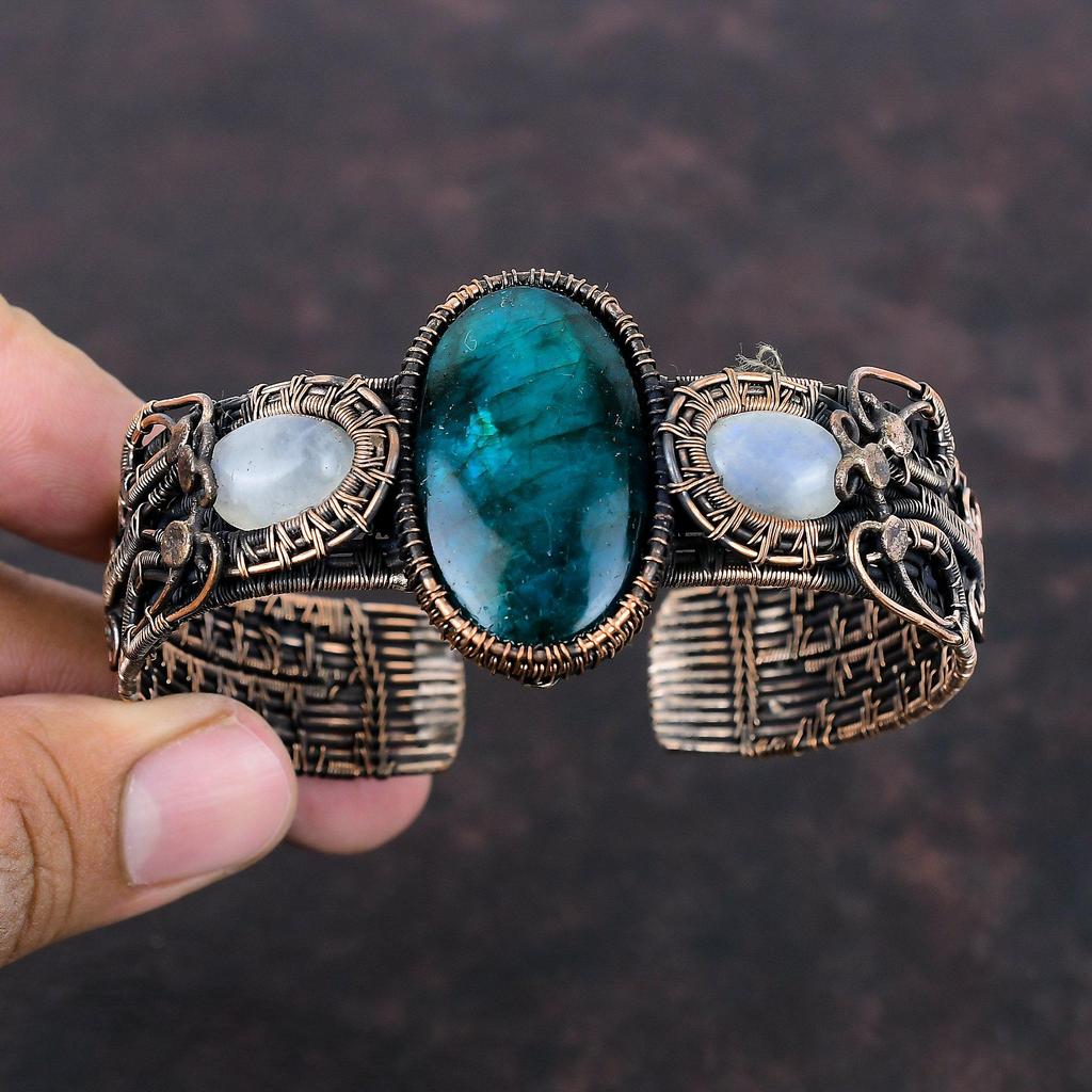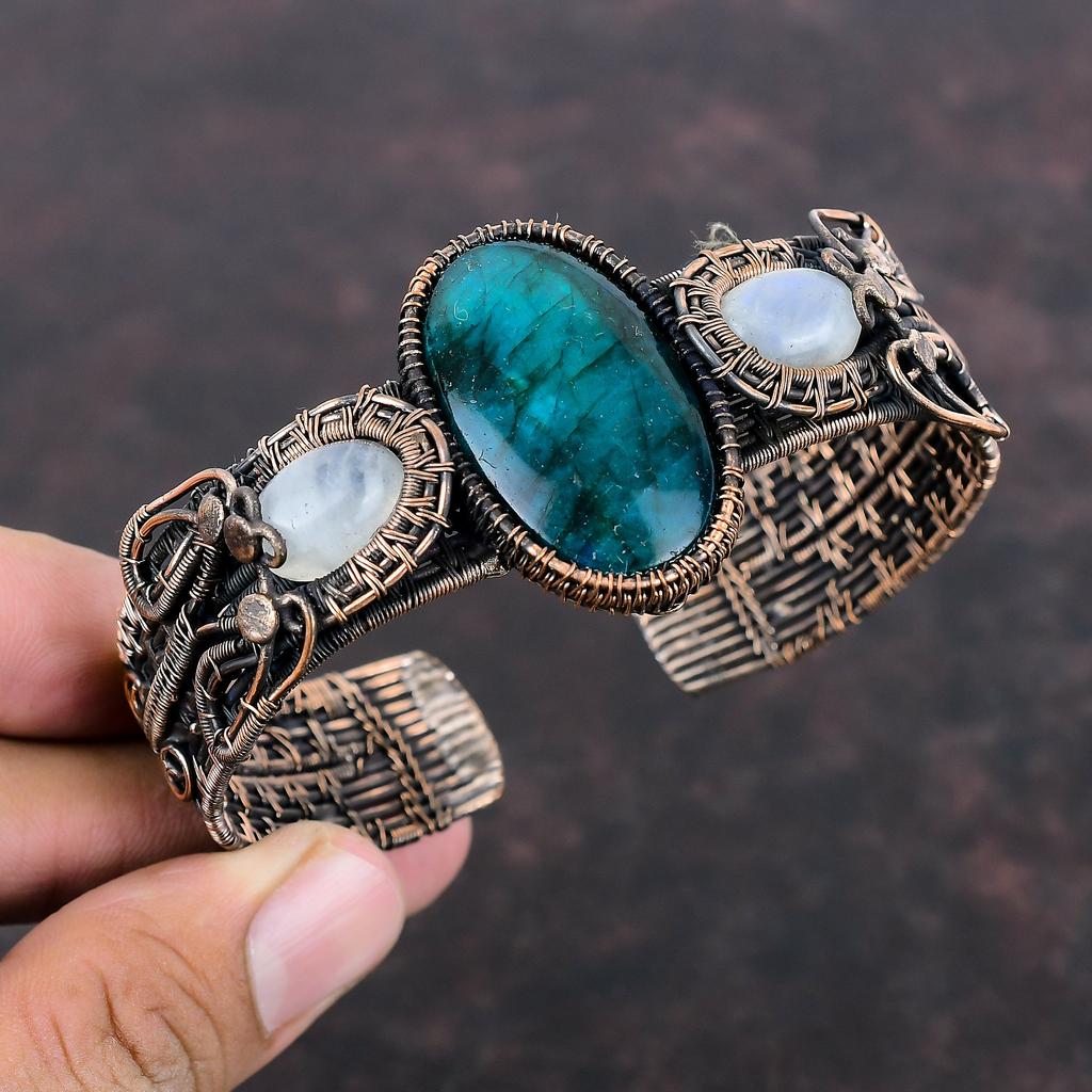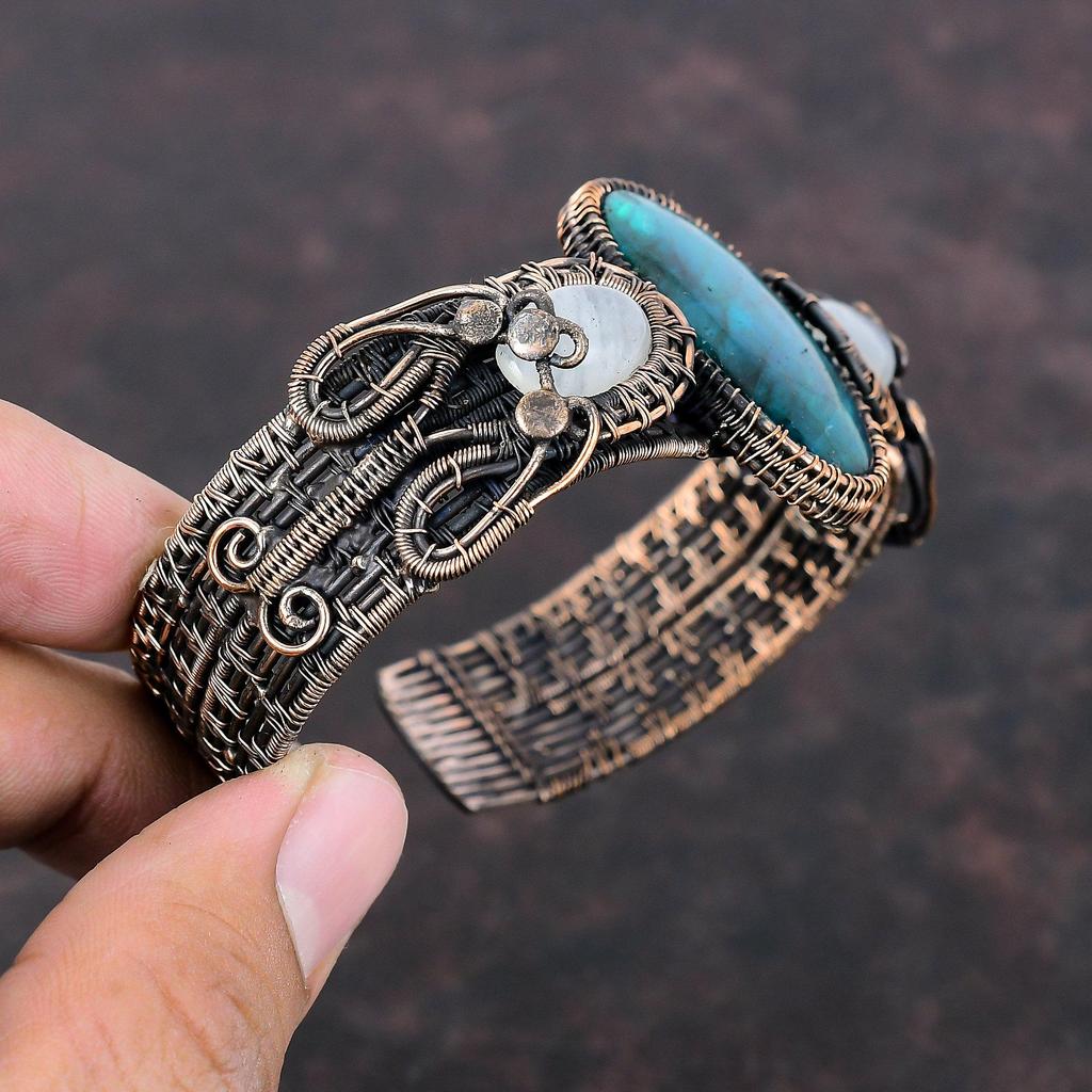 Браслет-манжета с неоновым вспышкой из лабрадорита, браслет из медной проволоки, регулируемый браслет-манжета, браслет из радужного лунного камня, ювелирные изделия ручной работы из драгоценных камней