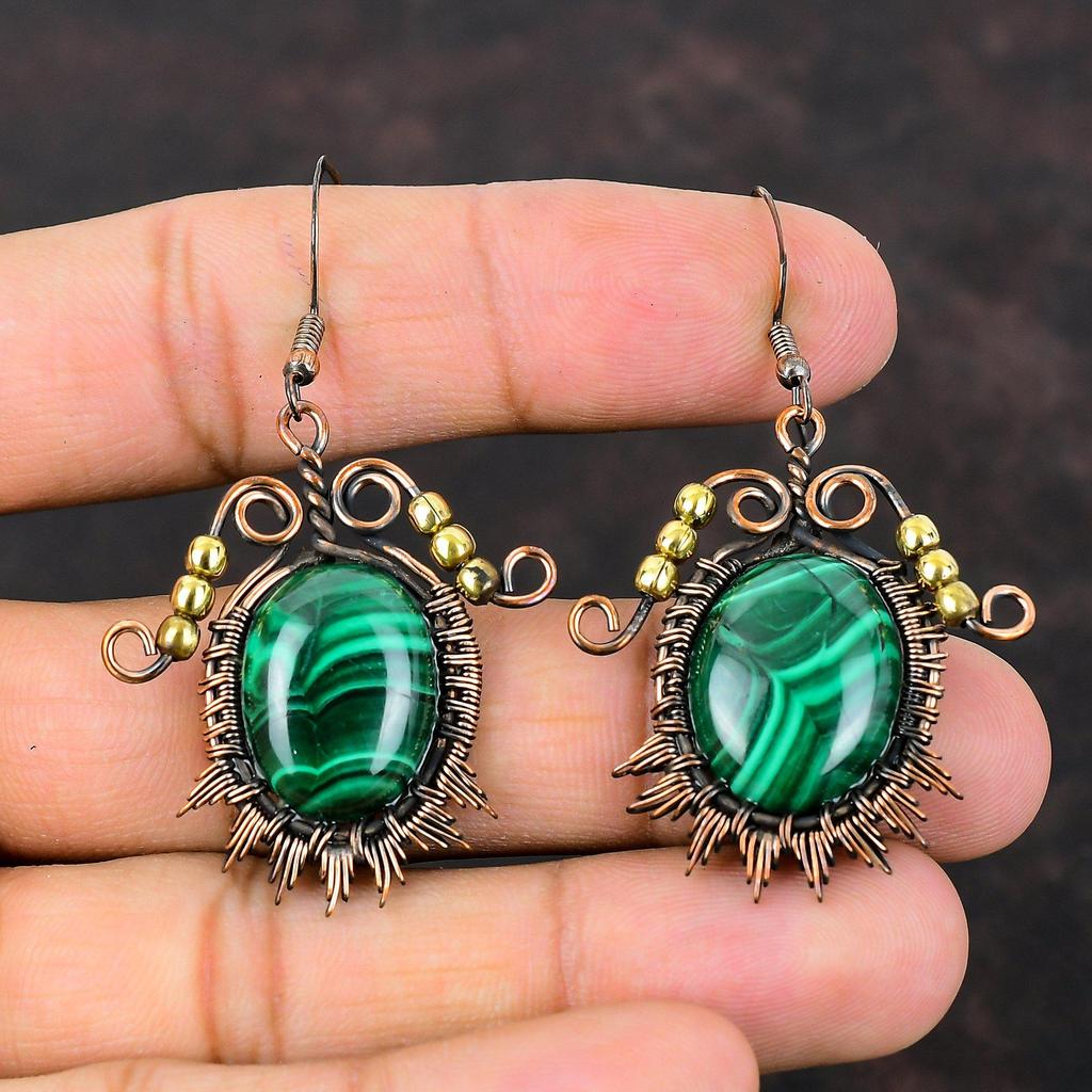 Малахитовые серьги, серьги из медной проволоки, серьги с драгоценными камнями, ювелирные изделия ручной работы, женские серьги, красивые медные украшения, стильные серьги, подарок для нее