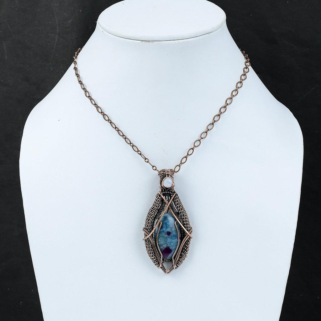Рубиновый синий кианит, медный кулон, кулон в проволочной обертке, драгоценный камень, медные украшения, лунный камень, кулон ручной работы, ювелирное изделие, подарок для него