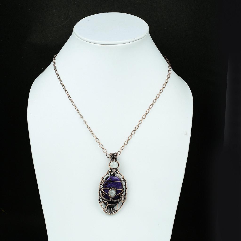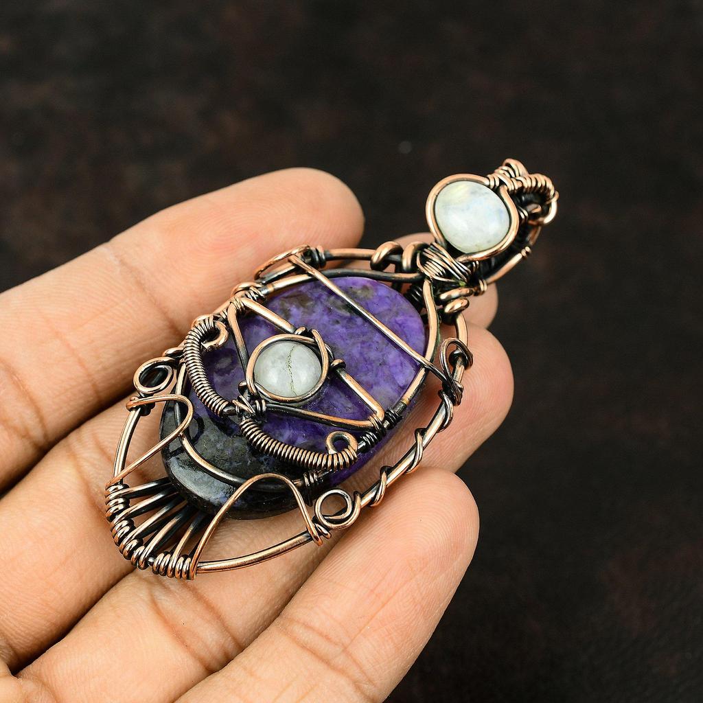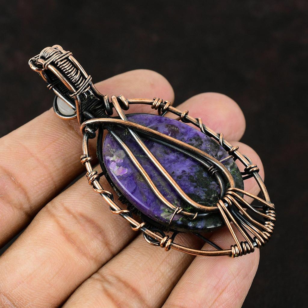 Кулон из чароита "Сглаз", обернутый медной проволокой, Ювелирное изделие из драгоценного камня, Кулон ручной работы, Радужный лунный камень, Украшение "Сглаз", Подарок для мамы
