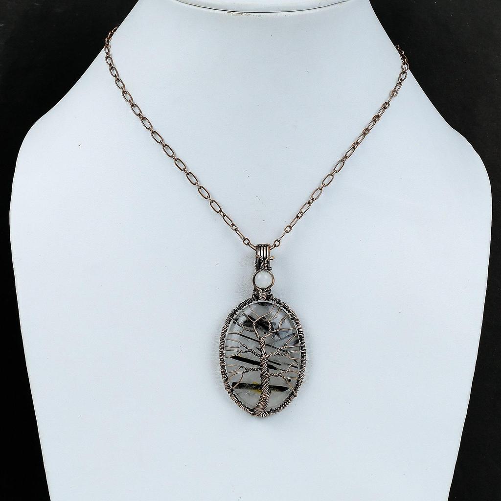 Подвеска из черного рутилового драгоценного камня «Дерево жизни», обернутая медной проволокой, изящная подвеска из радужного лунного камня, подарок для нее, медная подвеска ручной работы