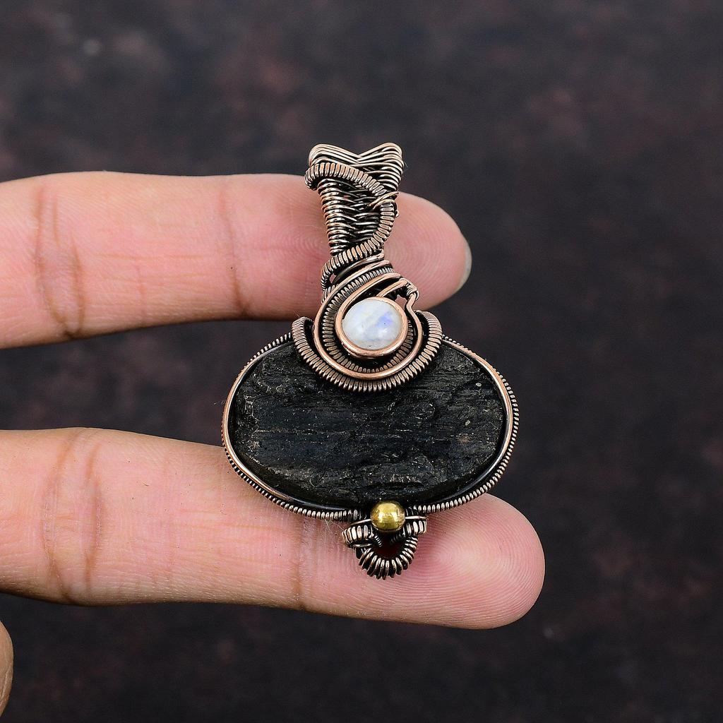 Черный турмалин, грубый кулон, медная проволока, кулон, Радужный лунный камень, ювелирные изделия из драгоценных камней, кулон ручной работы в стиле бохо, медные украшения для подарка
