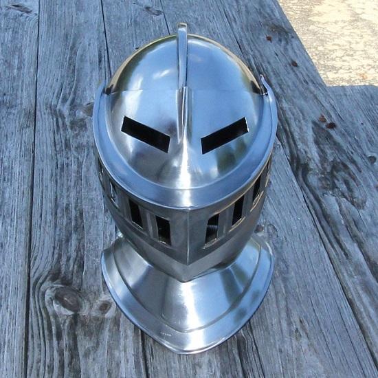 Шагните в прошлое с этим тщательно изготовленным закрытым рыцарским шлемом средневекового Возрождения.. Эта реплика шлема середины века, изготовленная из полированной стали 18-го калибра, идеально подходит для реконструкций, косплея или в качестве яркого предмета в вашей коллекции.
