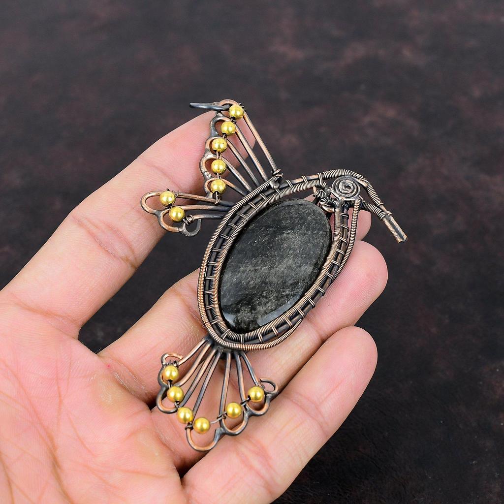 Серебряный блеск обсидиановый кулон Медная проволока Кулон ручной работы Подвеска из настоящего драгоценного камня Птица Кулон Медная проволока Ювелирный подарок для него