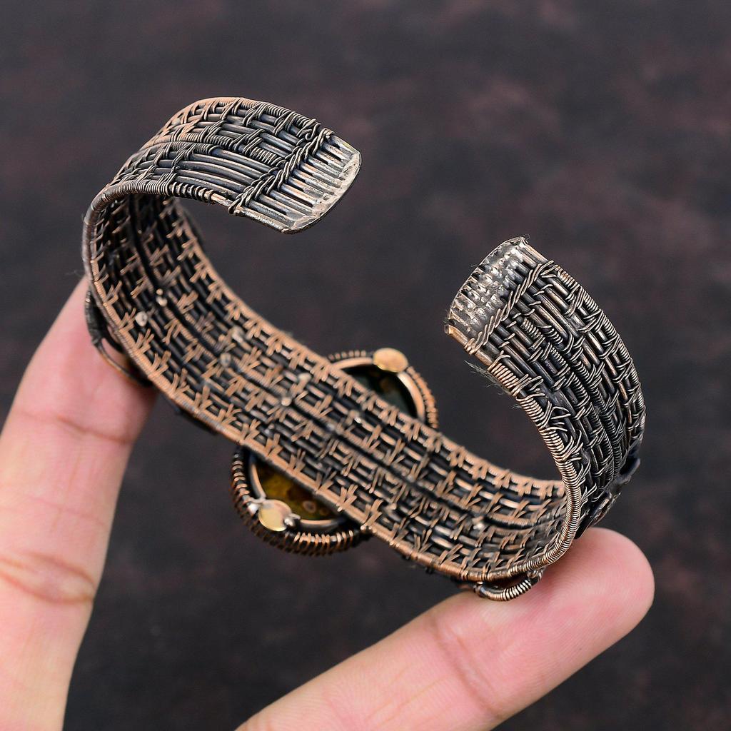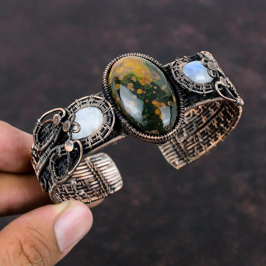 Браслет из океанской яшмы, браслет-манжета из медной проволоки, браслет-манжета с радужным браслетом из лунного камня, ювелирные изделия ручной работы, браслет из драгоценных камней, регулируемая манжета, подарок для него