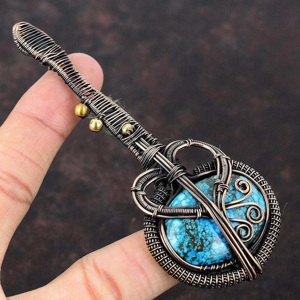 Тибетская бирюза кулон, кулон, обернутый медной проволокой, кулон из драгоценного камня ручной работы, уникальный медный дизайн, ювелирное изделие, кулон в виде гитары, подарок на годовщину