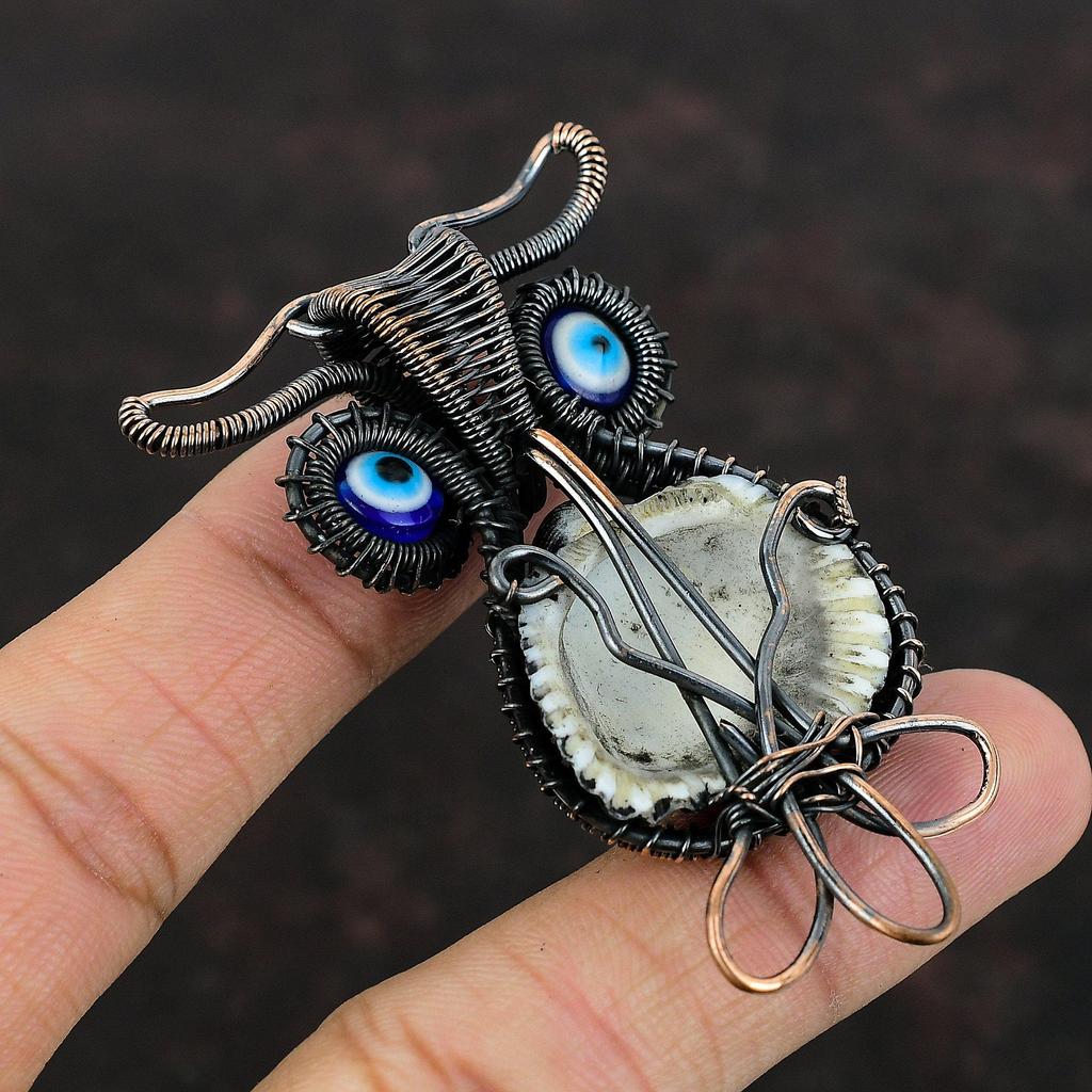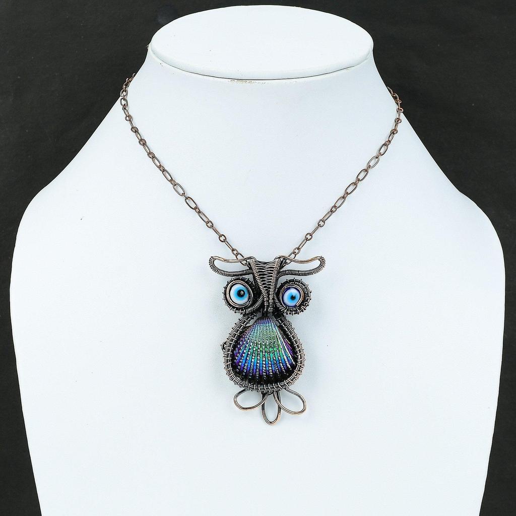 Медный кулон в виде ракушки с титановым покрытием Синий цвет Кулон от сглаза Проволочная подвеска с драгоценным камнем Подвески в виде совы Медные дизайнерские украшения ручной работы