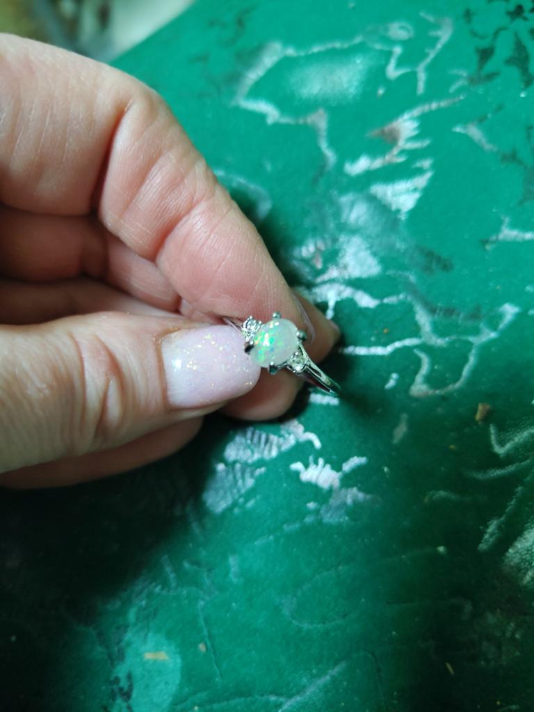 Простое металлическое кольцо с опалом и бриллиантовыми акцентами для помолвки и свадьбы
