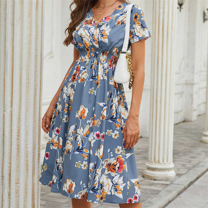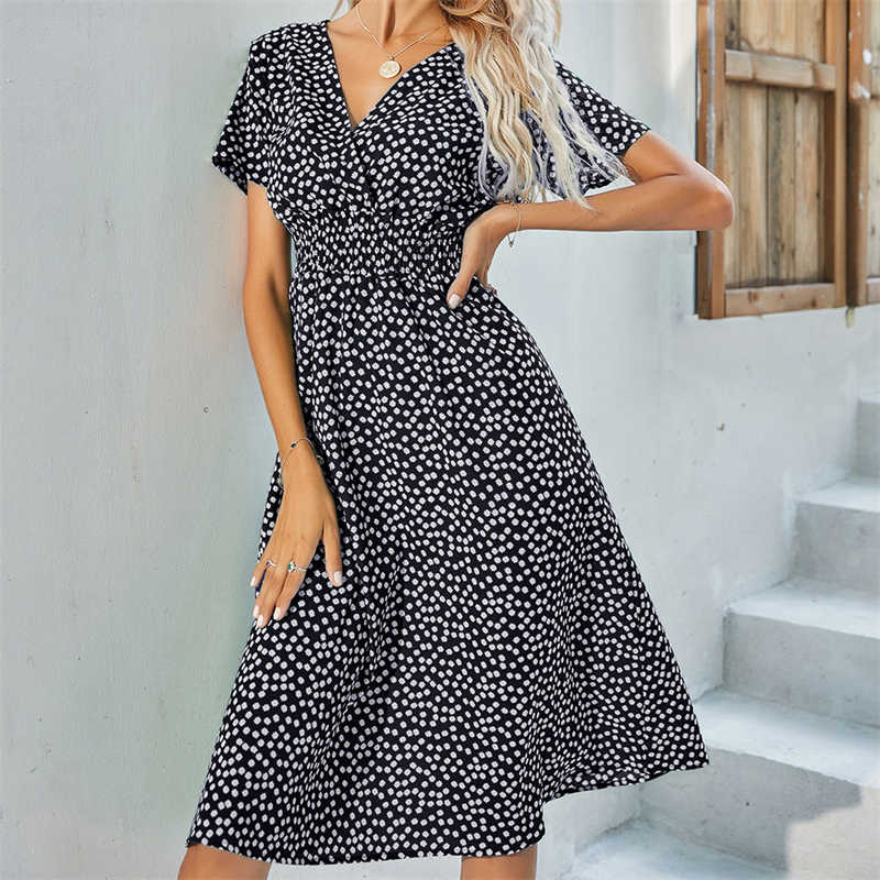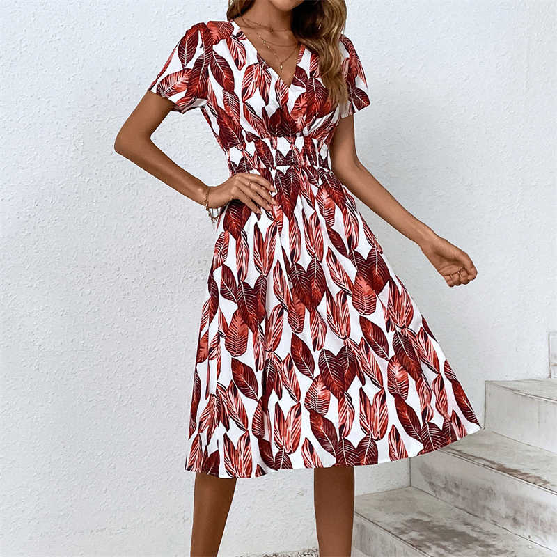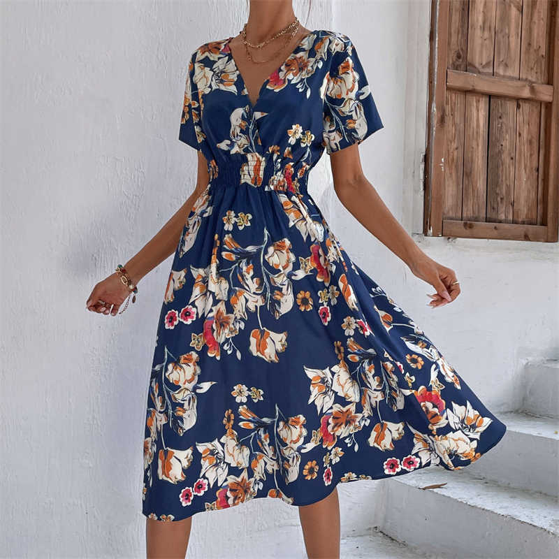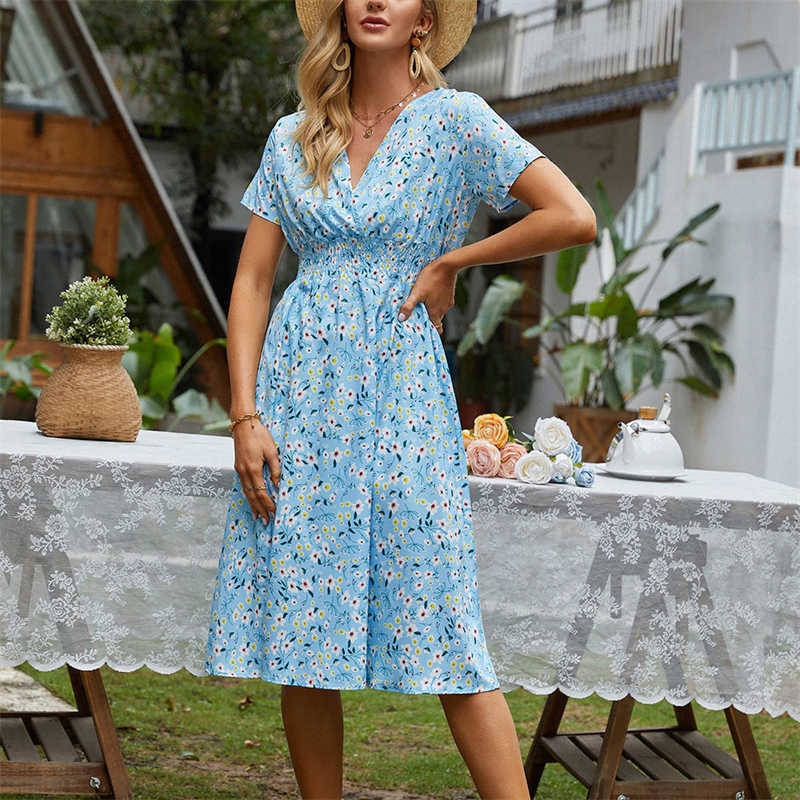 V-образный вырез с мелким цветочным принтом, простота, летняя горячая распродажа, женская одежда, платье с коротким рукавом, средняя юбка