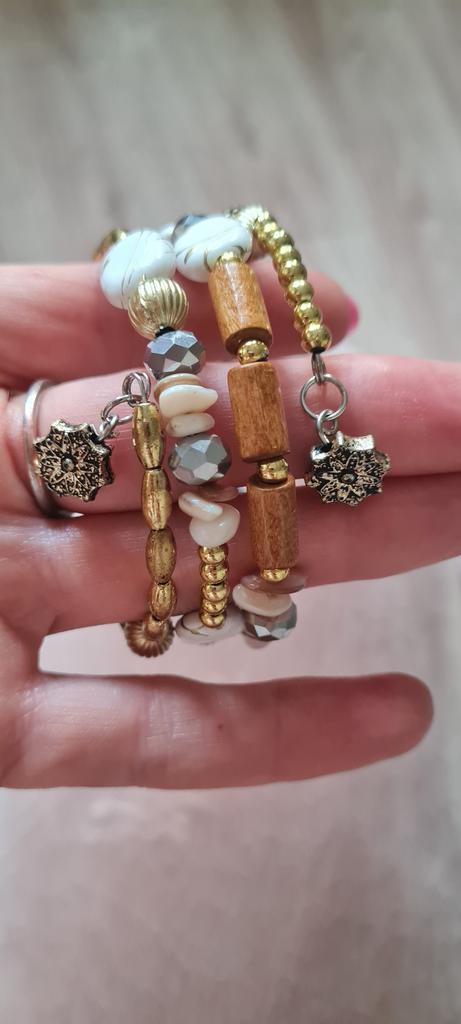 Браслет симпатичный, в составе есть деревянные бусины и бусины из розового кварца, но золотые бусины сильно дешевят. И снежинки-подвески царапают руку. Носить не приятно. В идеале лучше перебрать браслет.