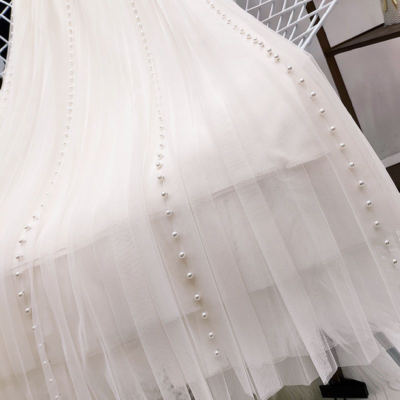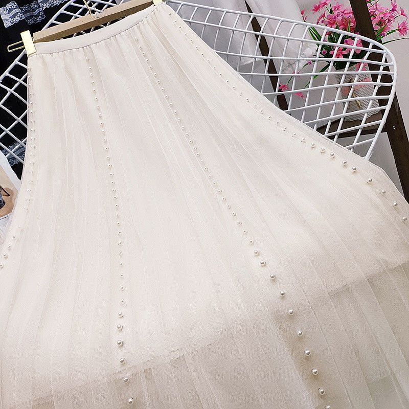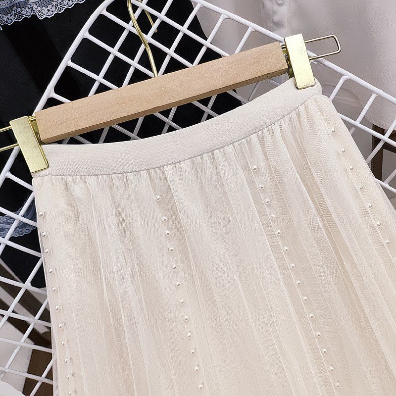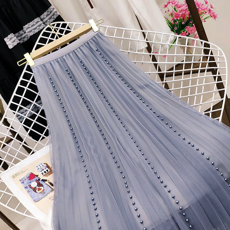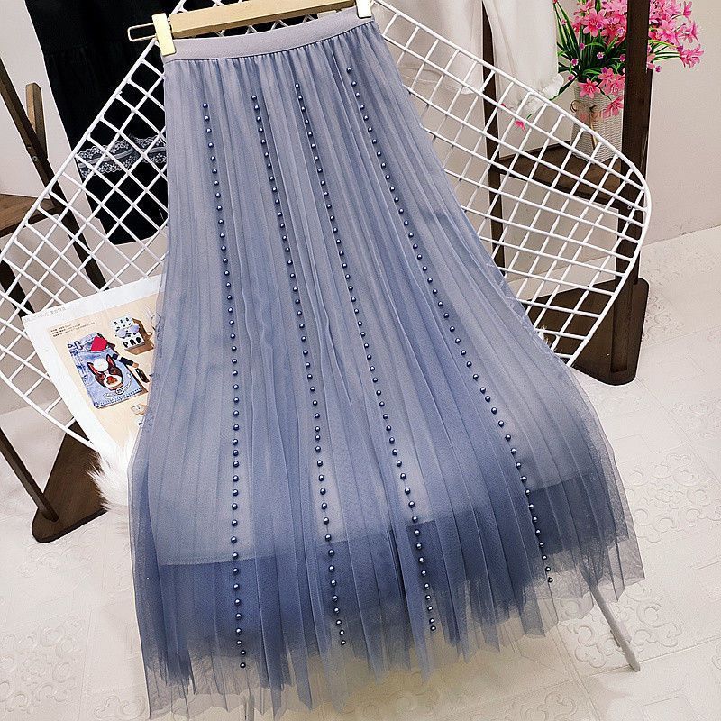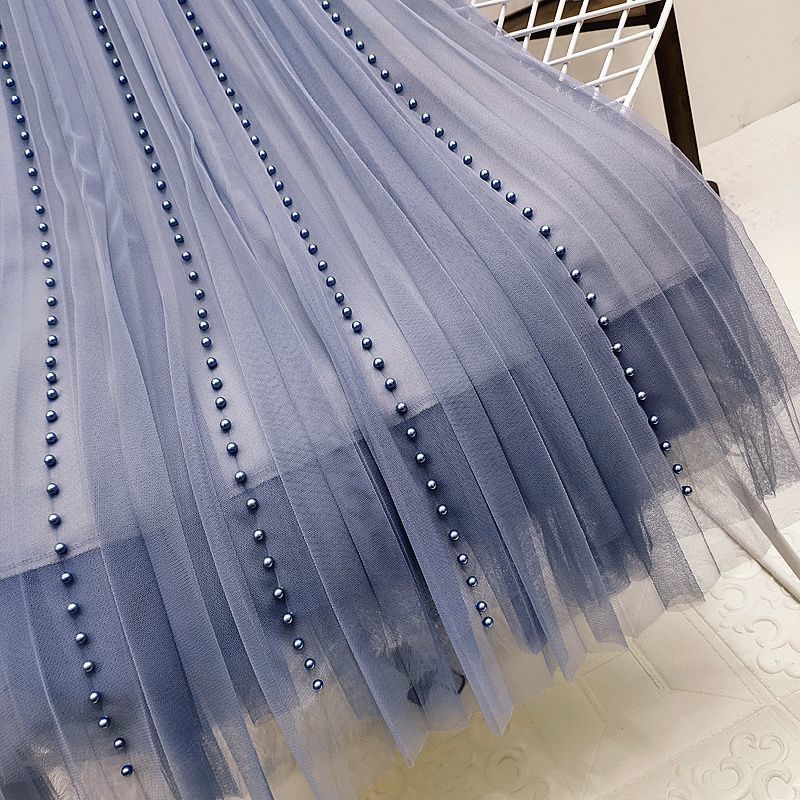 Тонкое сетчатое женское платье средней длины с высокой талией и бисером Плиссированное платье трапециевидной формы средней длины с бисером Модные однотонные универсальные сетчатые платья средней длины