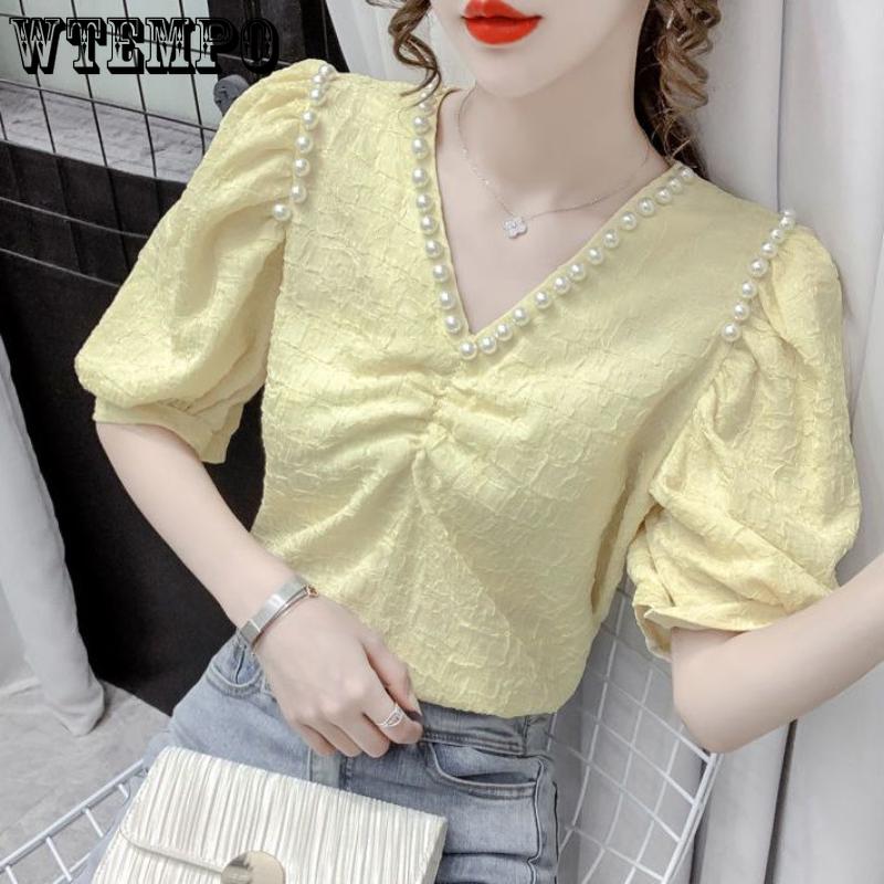 WTEMPO Брендовая женская шифоновая рубашка с v-образным вырезом и тиснением из бисера, летние модные универсальные свободные и тонкие топы с короткими рукавами и пузырьками