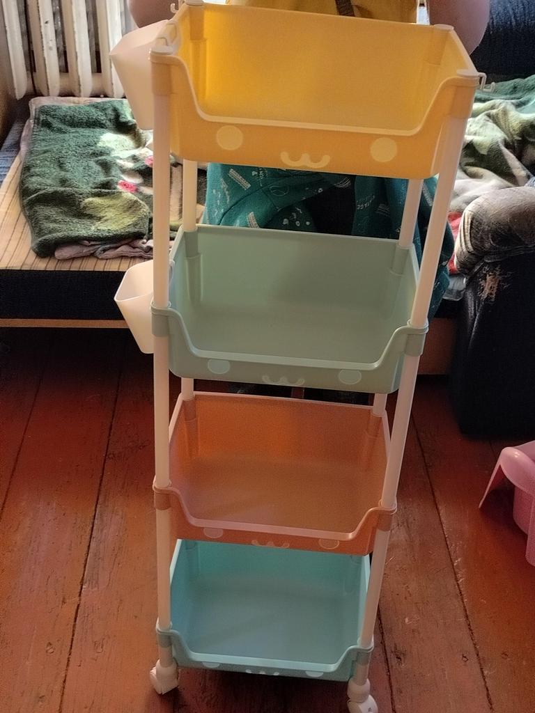 Посылка пришла в срок. Коробка очень помята, содержимое не пострадало. Всё комплектующие на месте. Красивая цветная этажерка, но ящики очень маленькие. Дочка довольна. Спасибо продавцу и джум.