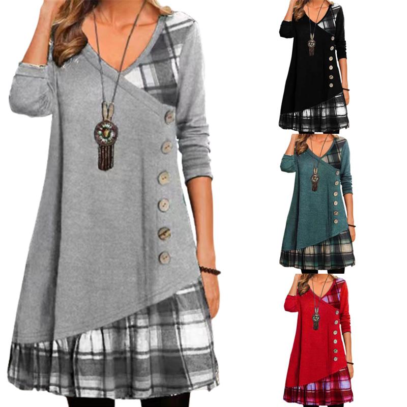 Женское повседневное свободное платье с длинным рукавом в стиле пэчворк, украшенное пуговицами, клетчатое платье с принтом