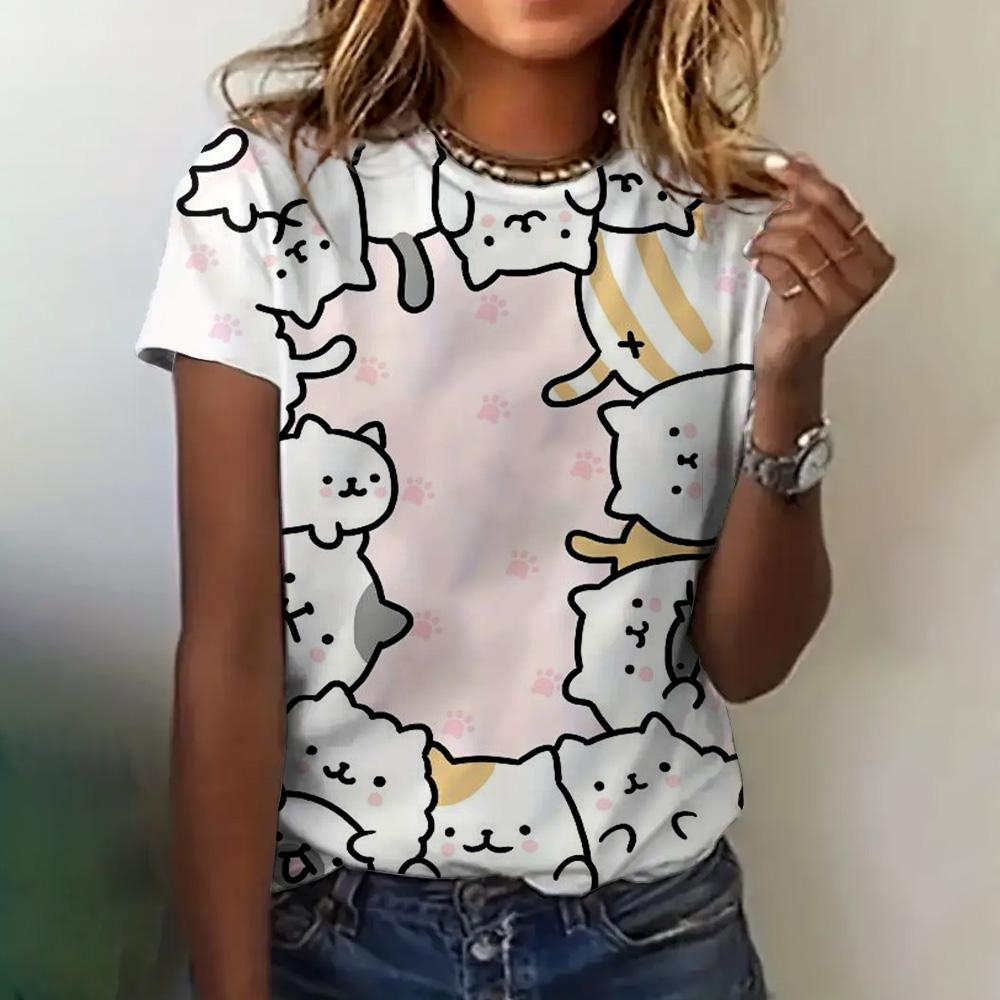 Женская одежда Футболка Летний круглый вырез с коротким рукавом Топ с 3d принтом кота Повседневный свободный модный топ с короткими рукавами Женская футболка