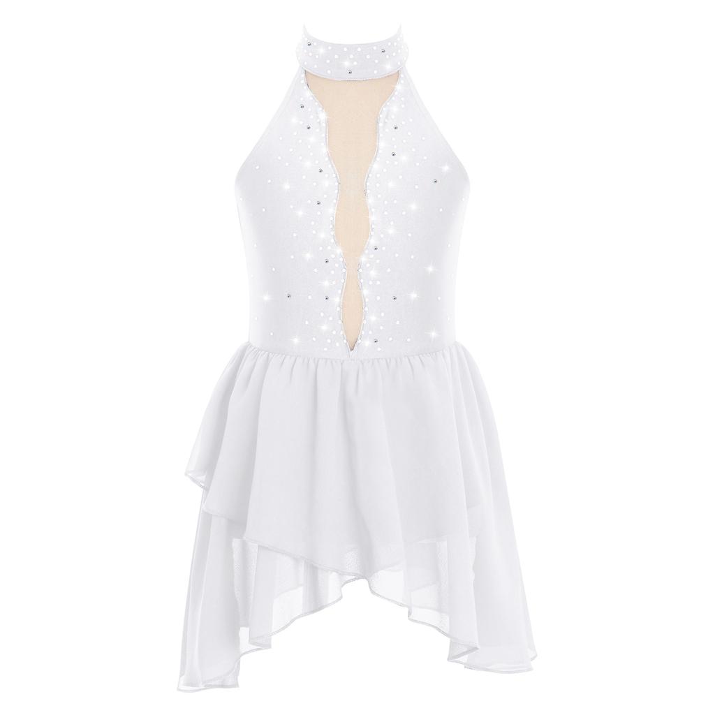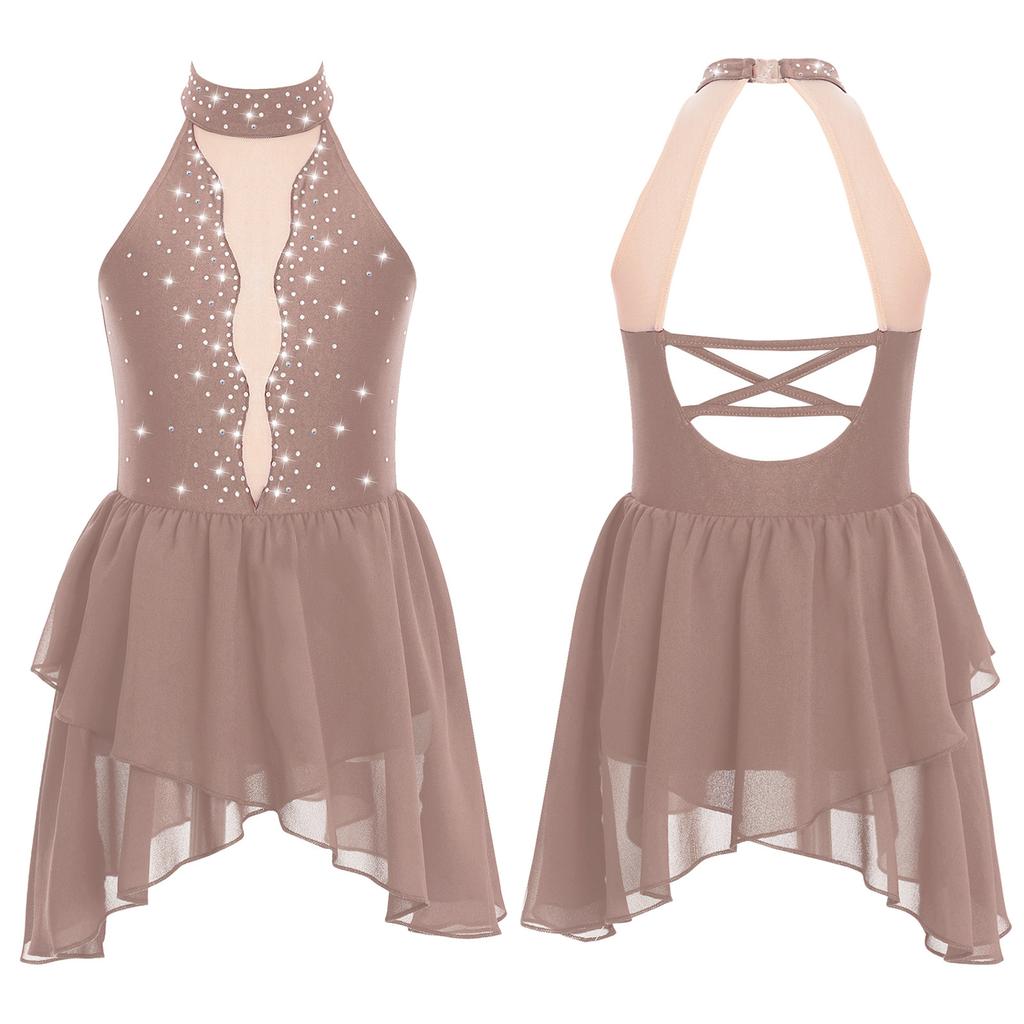 Детский балетный костюм для фигурного катания со стразами для девочек, лирический танцевальный костюм, прозрачное сетчатое платье с воротником-стойкой и открытой спиной, платье с неровным подолом, танцевальная одежда