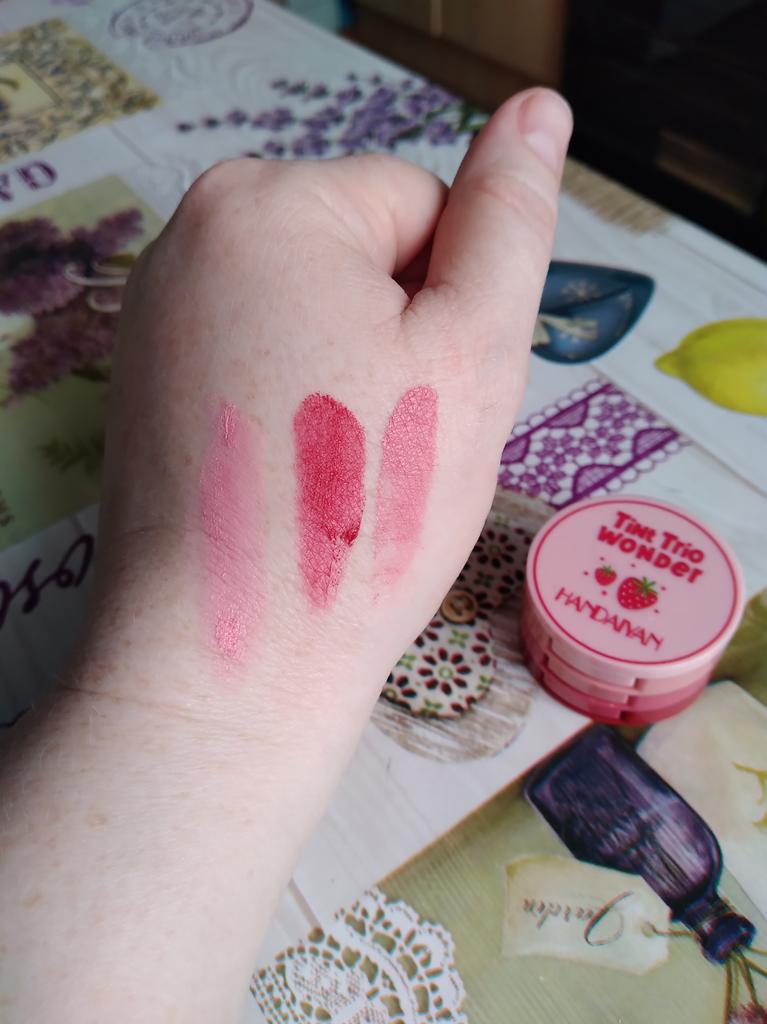 Интересная палетка кремовых румян 3 в 1, румяна светло-розовые🌺, коралловые🌹и вишнёвые🍒, пигментация у всех продуктов хорошая, приятно пахнут фруктовой отдушкой, пришла палетка целая, без повреждений, продавцу спасибо🤗, по качеству пока не знаю, буду тестировать, рекомендую🥰 Срок годности до 19.09.2027
