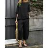 Женский комплект из хлопка и льна, весенне-летний однотонный повседневный топ с круглым вырезом и брюками со средними рукавами, комплект из 2 предметов