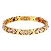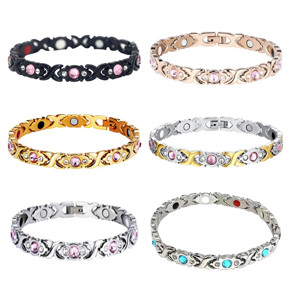 4. Модный дизайн: Браслет для магнитной терапии украшен элементом из стразов, который придает изделию стильный и сверкающий вид.. Изготовленный из сплава с инкрустацией искусственными драгоценными камнями, он станет модным дополнением к любому наряду..
