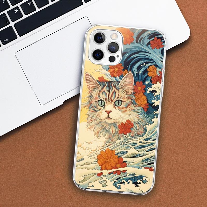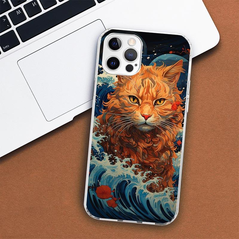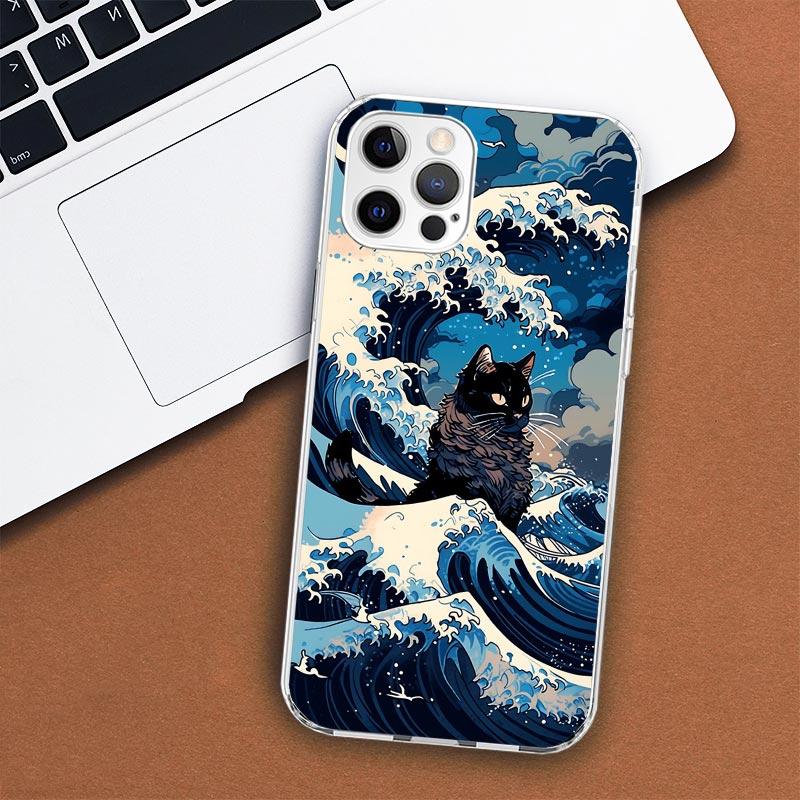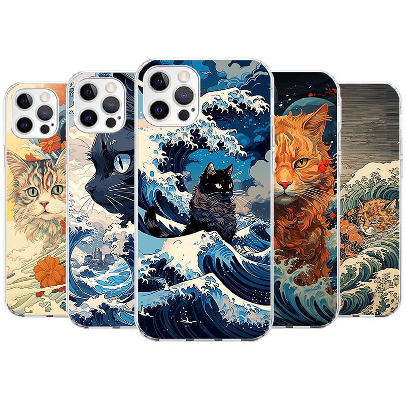 Эстетический чехол для телефона с изображением кота и морской волны для Apple iPhone 11 12 13 15 14 Pro 7 XR X XS Max 8 Plus + Mini SE, мягкий мягкий принт с индивидуальным принтом