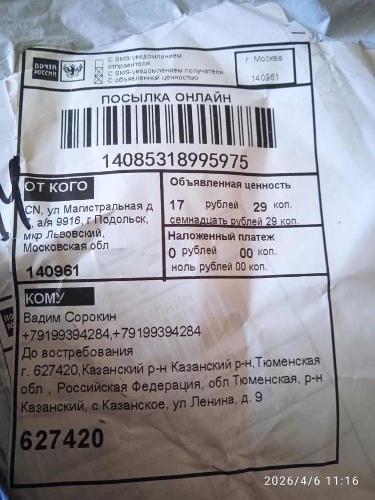 Товар отсутствовал в объедененой посылке. По факту пришло пять предметов из шести. Где искать виновного неизвестно .Толи продавец или почта недобросовестно отнеслись к отправке. Хотя заявлено 6 предметов в посылке. Отвратительная площадка...