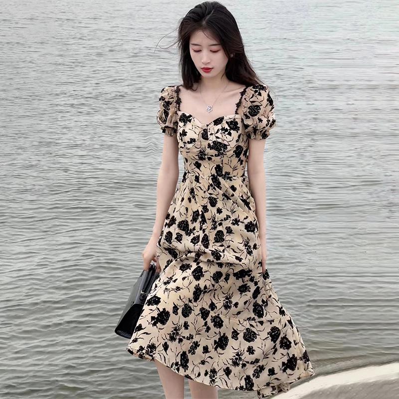 Летнее женское платье с фрагментарным цветком, длинное платье с французским принтом черной розы, слегка тонкая элегантная большая юбка