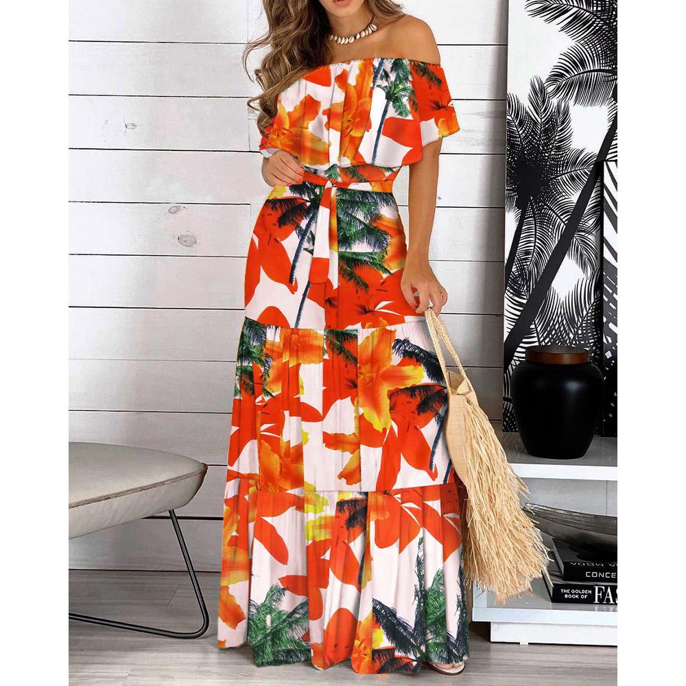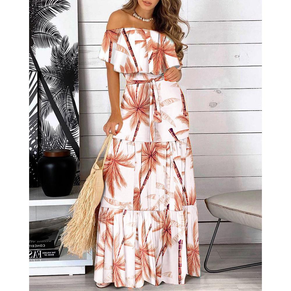 Летнее женское длинное платье с рюшами и открытыми плечами на шнуровке и принтом