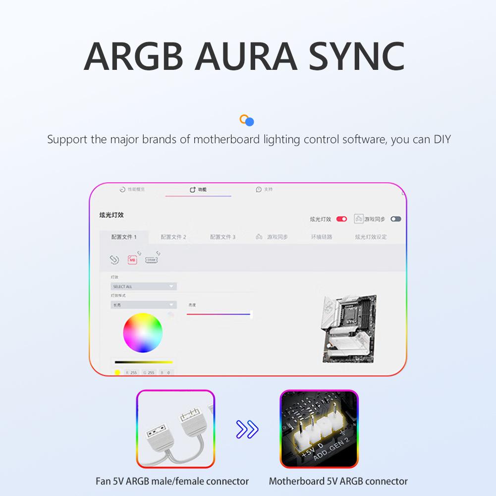 4. Синхронизация ARGB 5 В: Совместимость с материнскими платами ASUS, MSI, Gigabyte, ASRock и другими с адресными разъемами ARGB 5 В, позволяющими создавать программно-управляемые световые эффекты.. Охлаждающий вентилятор корпуса процессора с 26 светодиодами ARGB высокой плотности и высокой яркости поддерживает 16,8 миллионов цветов, создавая яркие и захватывающие световые дисплеи..