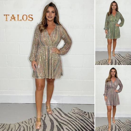 Это платье, выполненное из высококачественной полиэстеровой ткани, украшенной яркими пайетками, обеспечивает модный стиль и удобство ношения в течение всего дня.