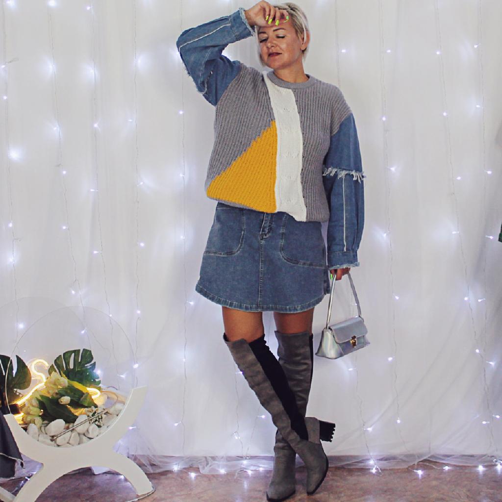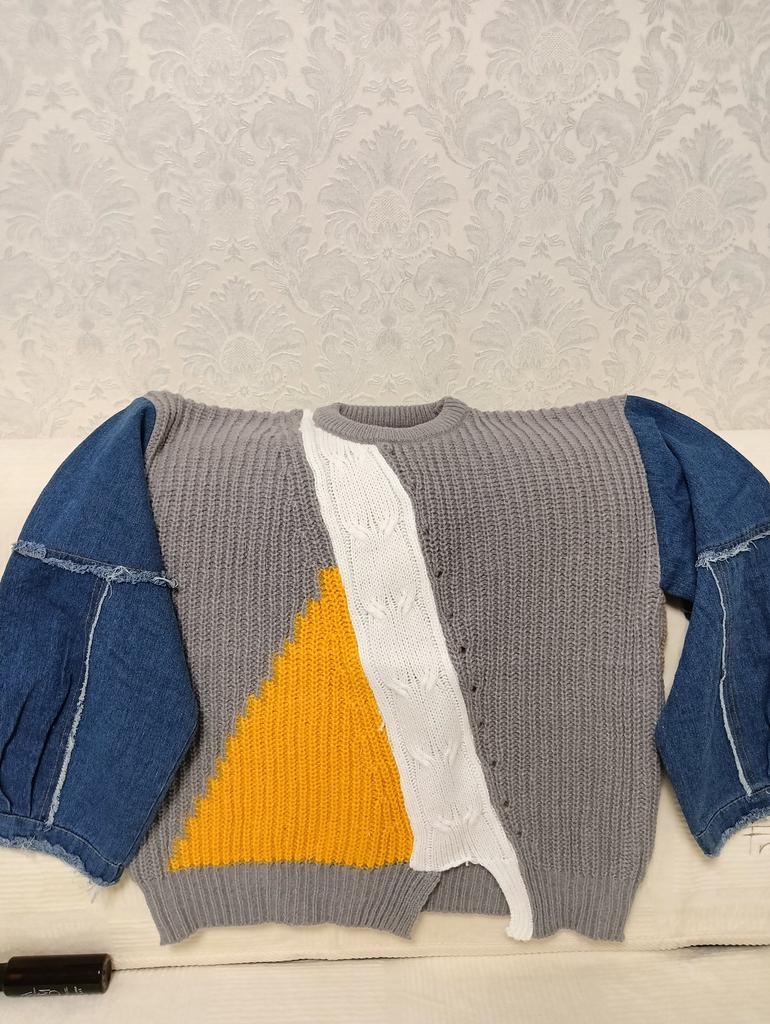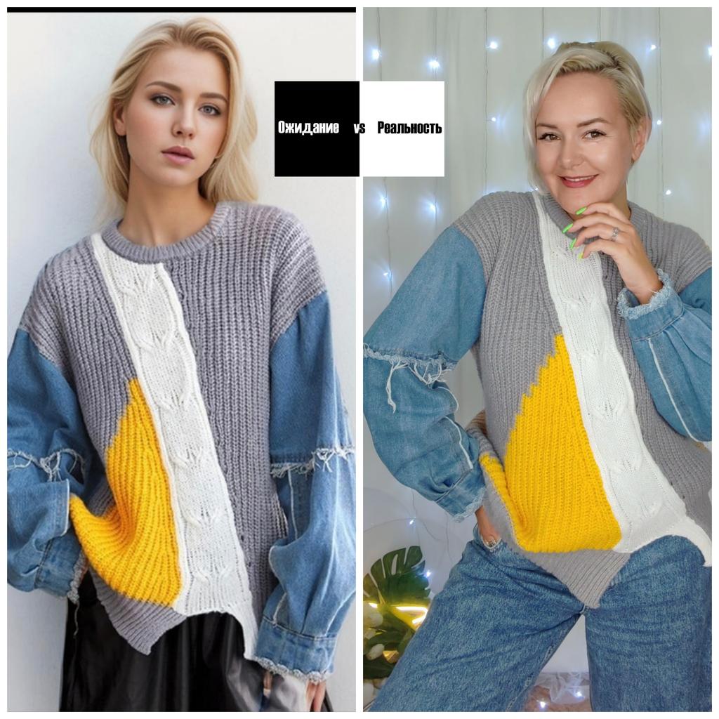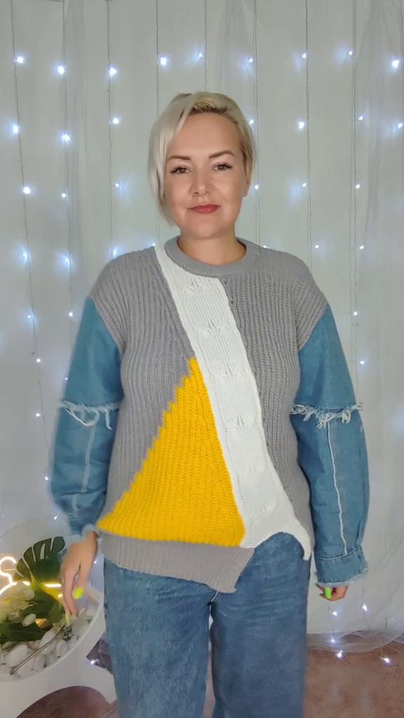 Эксперементируем с тканями 😍 Привет! Один из любимых джемперочков, который буду носить с большим удовольствием! Свободный, тёплый, оригинальный. ‼️Добавила не большое видео, там больше деталей ‼️ Ткань : Сшито из двух видов ткани: Рукава 100% длина не тянется, плотная, но мягкая ткань. Вязка - нитка акриловая воздушная, но тёплая. Тянется. Дизайн : Очень свободный джемпер, на меня сел, как оверсайз. Рукава длинные мне на мой рост ещё и погибать приходится, чему я очень рада. Спереди сбоку небольшой разрез. Рукава оформлены не обработанным швом с нитками - что выглядит стильно и молодёжно. Нюансы: Для себя не нашла. Качество : Супер, сшит очень хорошо. Сезон: Весна/зима/осень Цвет : Серый, жёлтый, белый, голубой Размер: На мне единый размер. Мои параметры : рост 172 см 98/76/106 см Детали : Длина 64 см Плечи 53 см Длина рукава 57 см ОГ 132 см ОТ 118 см *не тянула, пот тянется ещё +15 см Резюмирую : Очень, очень крутой джемпер! Смотрится оригинально, стильно, дорого. Самое классное, что отлично вписывается в повседневные образы! Рекомендую 👍 Я не прощаюсь, M_K Вязанная_джинса