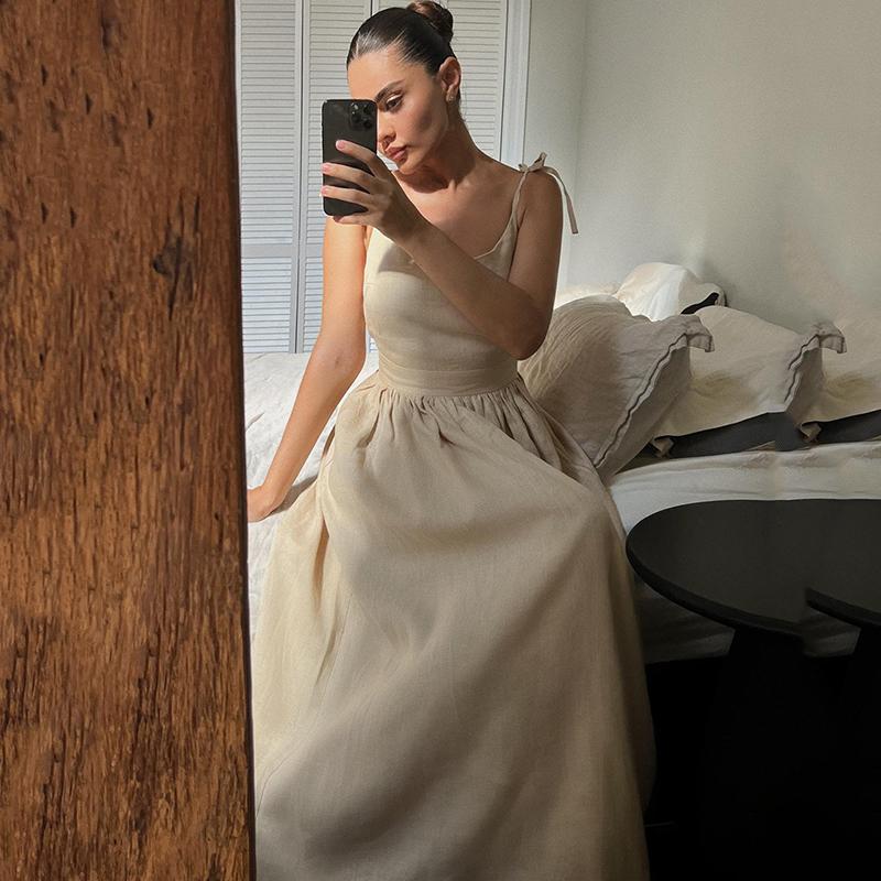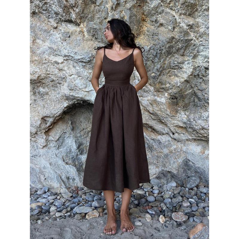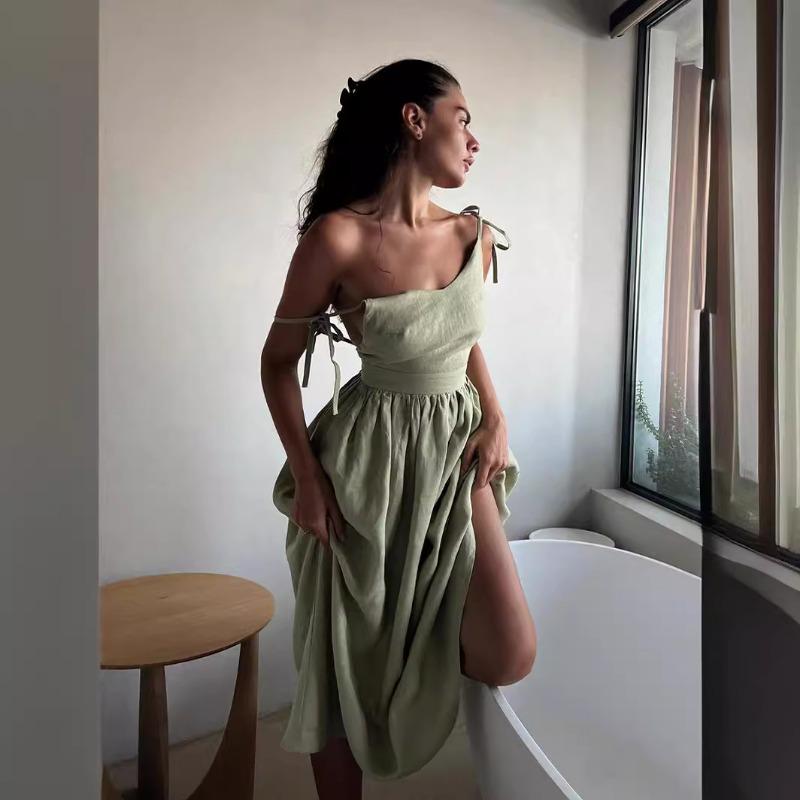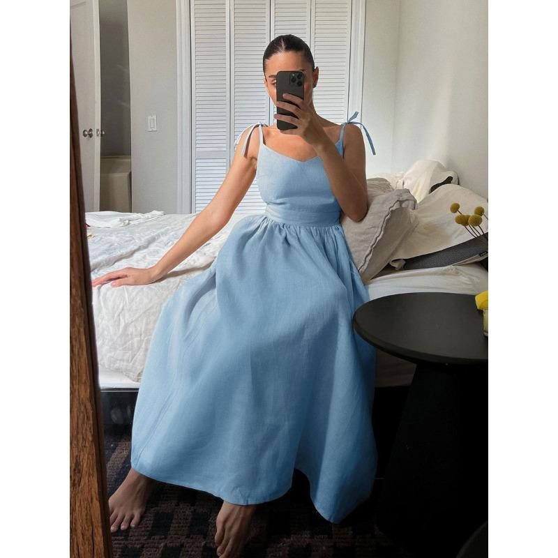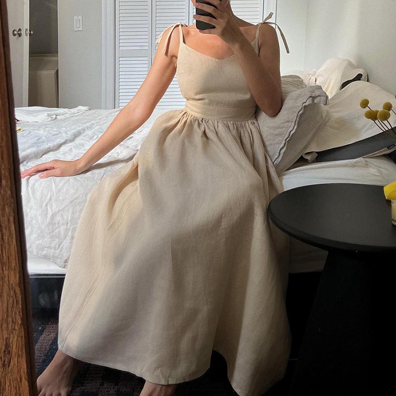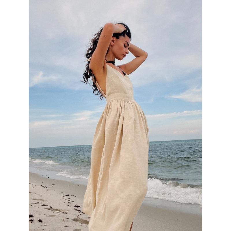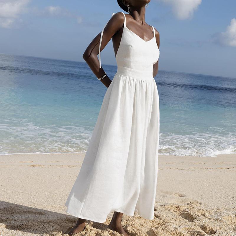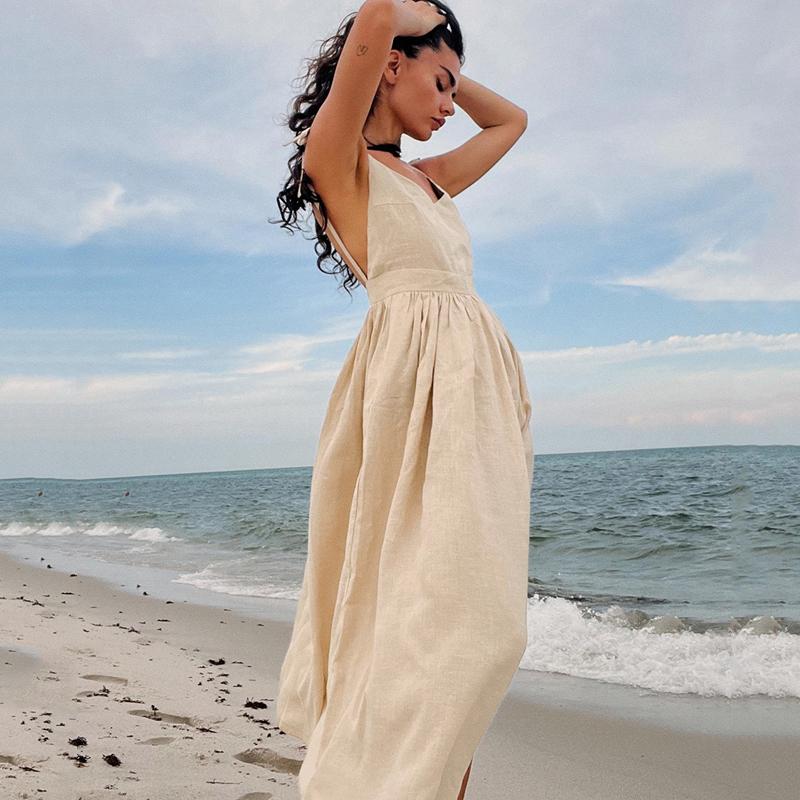 Сексуальное хлопково-льняное повседневное платье с открытой спиной, женское летнее элегантное повседневное пляжное платье без рукавов, женское вечерние однотонные свободные платья на шнуровке 1031
