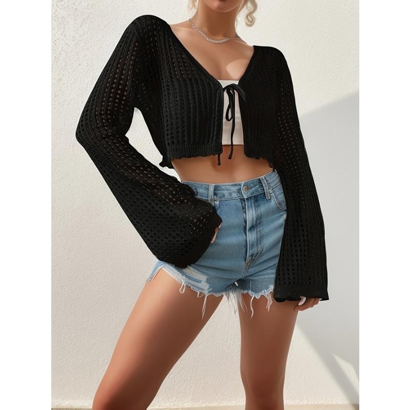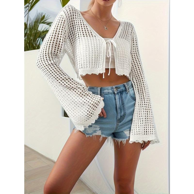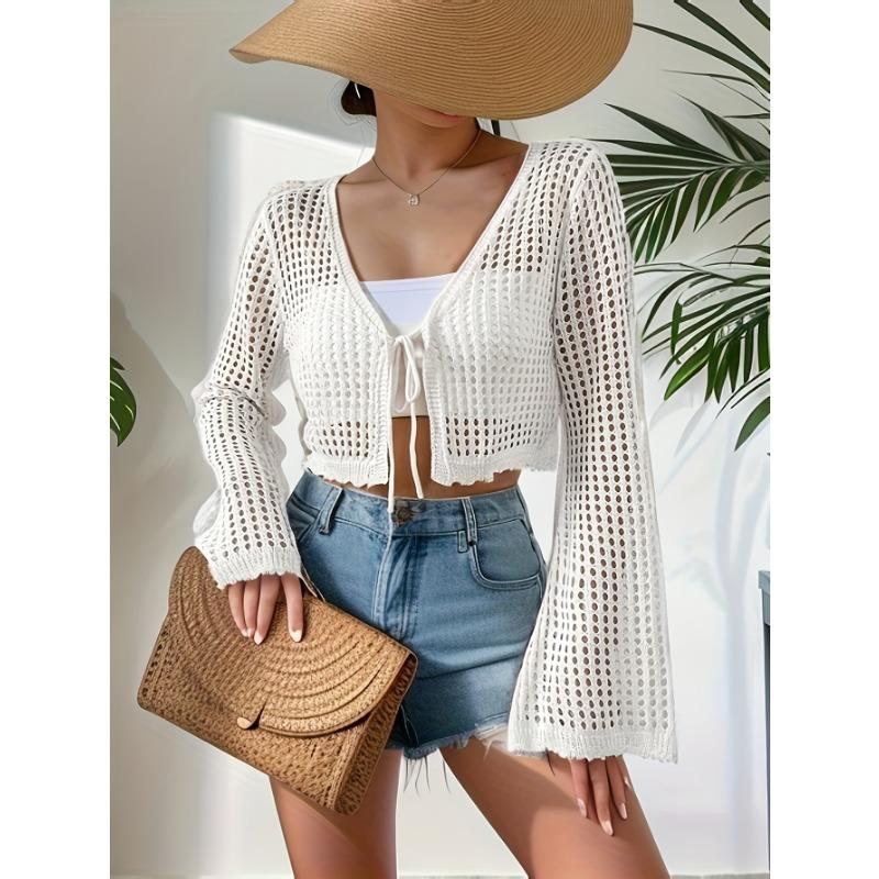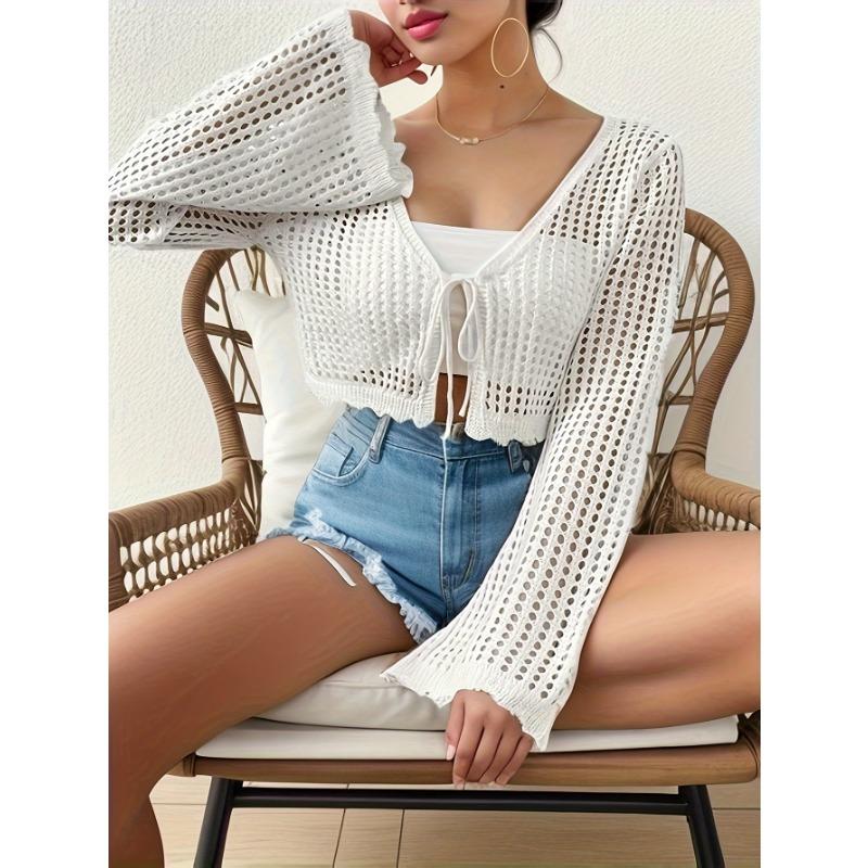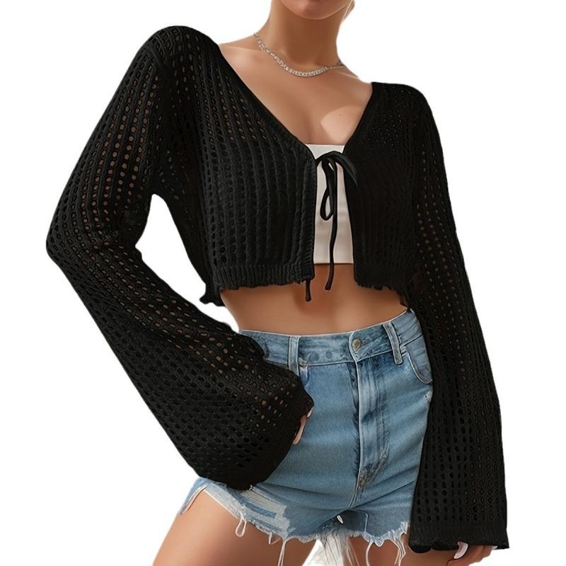 Весенне-летний женский кардиган с v-образным вырезом и галстуком, пляжный однотонный сексуальный вязаный полый пляжный наружный солнцезащитный костюм