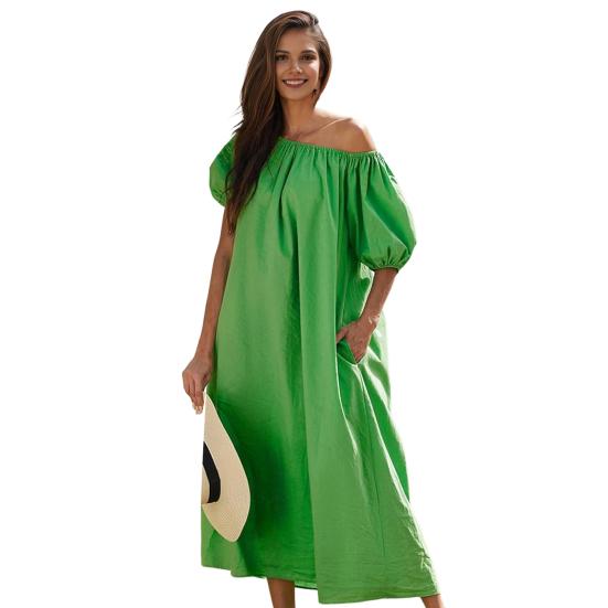 Улучшите свой гардероб этим женским повседневным элегантным платьем в ленивом стиле с пышными рукавами и скошенными плечами и короткими рукавами. Однотонный свободный дизайн создает повседневную, но элегантную атмосферу и идеально подходит для различных случаев..