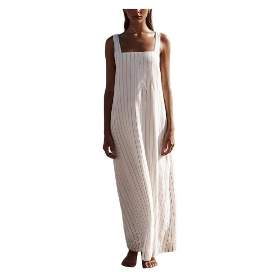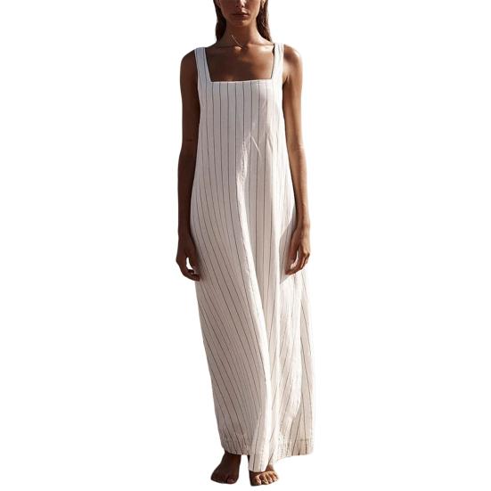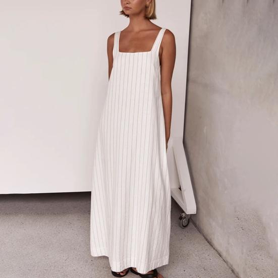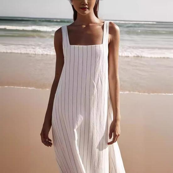 Ощутите простоту и элегантность этого платья без рукавов с квадратным вырезом и шикарным полосатым принтом, который придаст вашему образу нотку изысканности.
