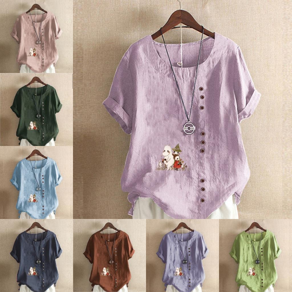 Женская модная футболка с круглым вырезом и коротким рукавом, повседневная рубашка из хлопка и льна с рисунком, свободная летняя блузка с принтом в виде цветов