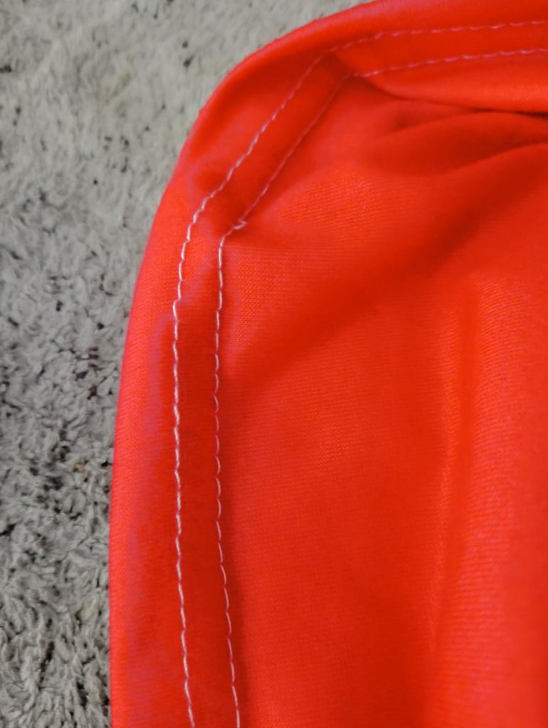 Красная футболка прошита белыми нитками, смотрится ужасно. Дома только ходить.