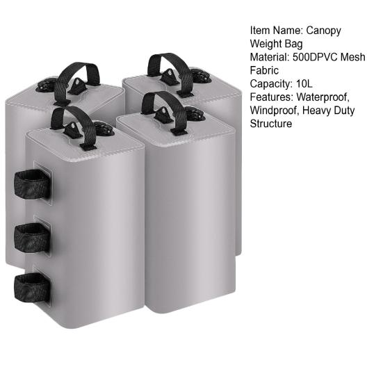 Вес опоры навеса большой емкости: Каждый мешок Gazebo Weight может вместить до 10 литров воды при наполнении, эффективно фиксируя навес или палатку и предотвращая их сдувание.. С легкостью защитите свое убежище на открытом воздухе, используя эти надежные грузовые сумки.