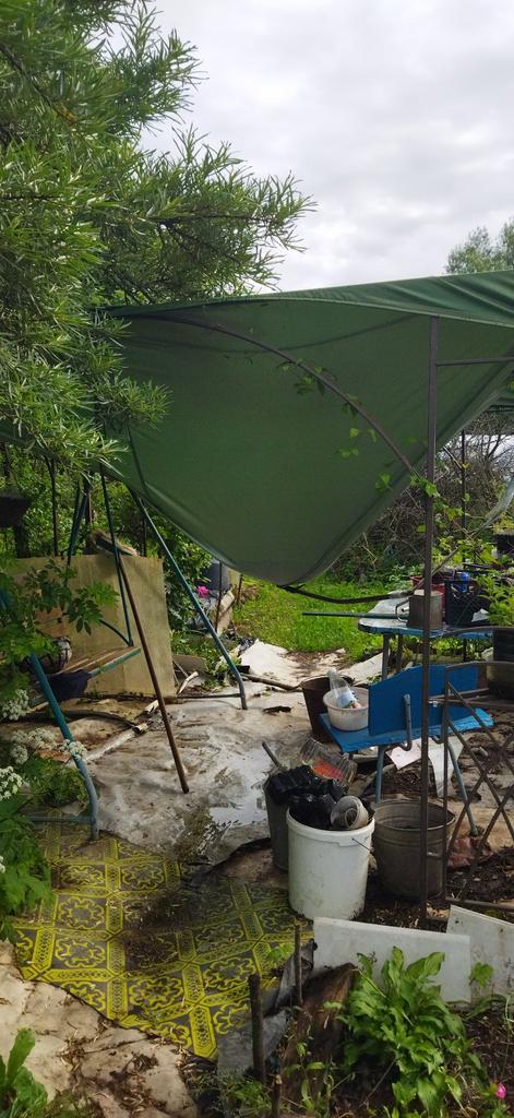 Материал синтетический, красивого цвета, вроде на должен промокать. Но вызывает сомнения сколько он продержится на солнце, хоть сезон не сгорит. И пока не уяснила с креплениями, буду позже разбираться. Крепления никакие, верхушка просто отдельный кусок ткани, который за уголки одевается на металлические штыри пагоды, если оставить так, то его сорвёт первым порывом ветра. У изначального покрытия, что покупалось вместе с беседкой, к покрытию пагоды, была пришита москитная сетка и она крепилась к основному покрытию по периметру на липучке, что мне придется и сделать. Отдельно покупать 4 метра липучки и сетку и пришивать, углы не уплотнены, просто стык ткани, крепеж к металлическим прутьям беседки закреплён на ткани слабо и его недостаточно. Так что покупка оставляет желать лучшего. Конструктор сделай сам, и кучу докупать, не известно сколько продержится сам материал покрытия. Кроме яркого цвета, ничего хорошего в покупке нет, надежд не оправдала. Переживала, что солнце спалит,но вышло ещё хуже, от дождя, ткань вытягивалась и образовывала мешки с водой, несколько раз сливала, но ночью был сильный дождь и воды набралось много, на фото видно, свисает почти до земли. Под тяжестью воды в растянутом тенте, поломалась вся верхняя часть беседки, местами даже выгнуло. Соединение со стойками, так, что теперь придется беседку покупать новую. Такой подставы ещё не попадалось