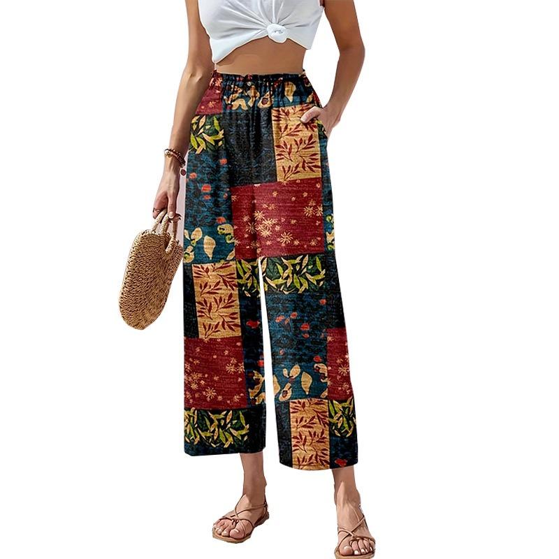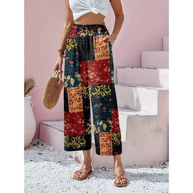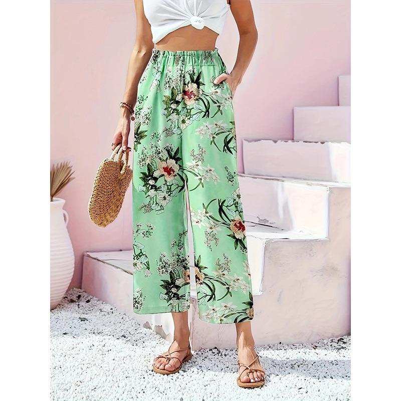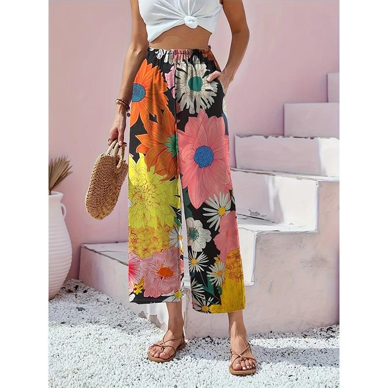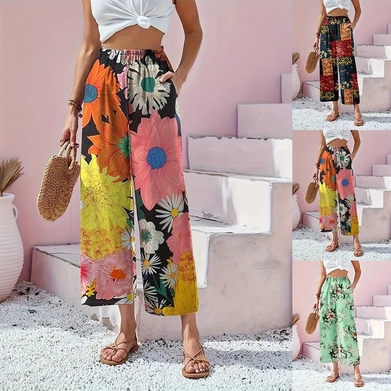 Модные винтажные широкие брюки с цветочным принтом, летние пляжные свободные повседневные брюки, женские модные элегантные брюки с высокой талией больших размеров 24522