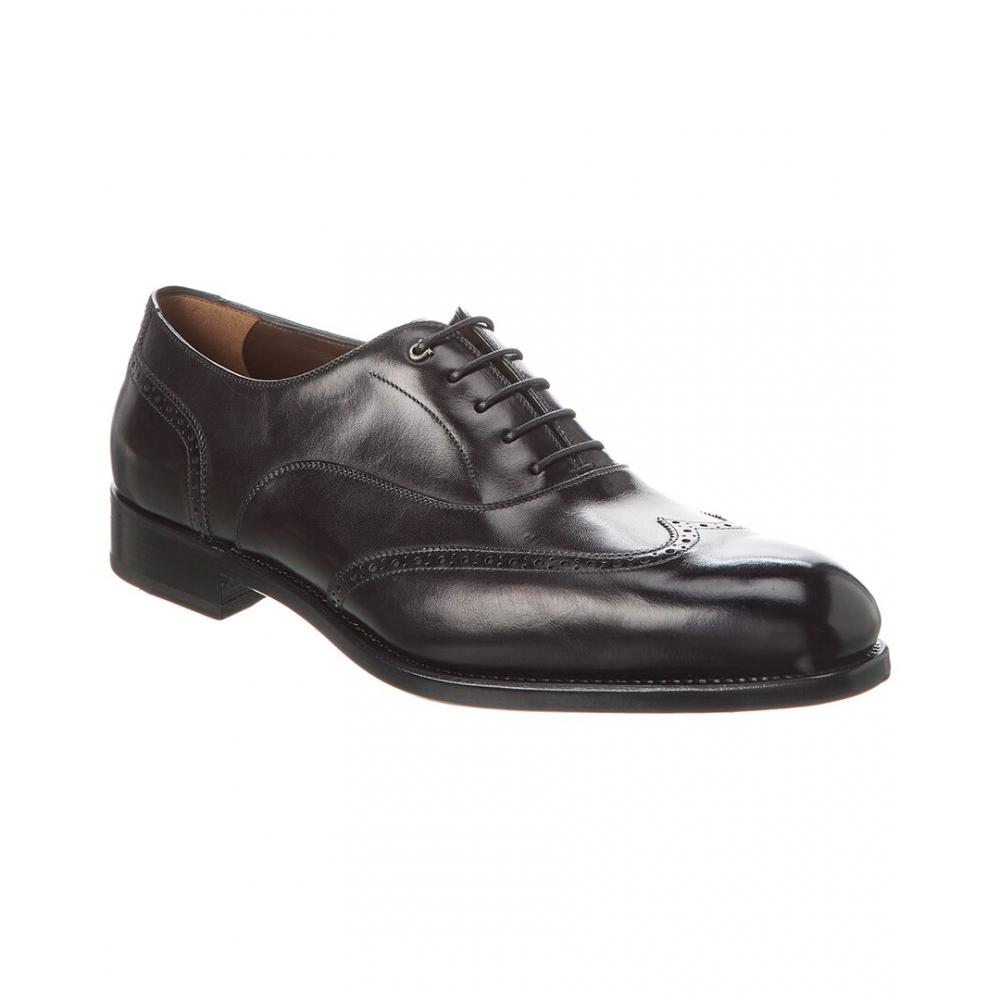 Elevate your formal attire with the Ferragamo Leather Dress Shoe from Salvatore Ferragamo. Made in Italy, this black leather oxford features a perforated wingtip design, lace-up closure, and a lightly padded leather insole for added comfort. The smooth leather sole and 1.25 inch heel provide a polished finish to any ensemble. Please note that all measurements are approximate and were taken from a size 8; slight variations may occur. Add a touch of luxury to your wardrobe with this iconic piece from Salvatore Ferragamo.