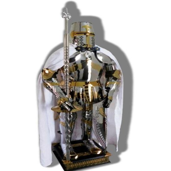 Окунитесь в величие средневековья с нашим тщательно созданным доспехом средневекового рыцаря.. Рост впечатляющий: 182,88 см. (6 футов), этот полный комплект доспехов — потрясающая дань уважения доблестным рыцарям прошлого.. Этот изысканный предмет, идеально подходящий для домашнего декора, обязательно станет центральным элементом любой комнаты, излучая ощущение истории и доблести.