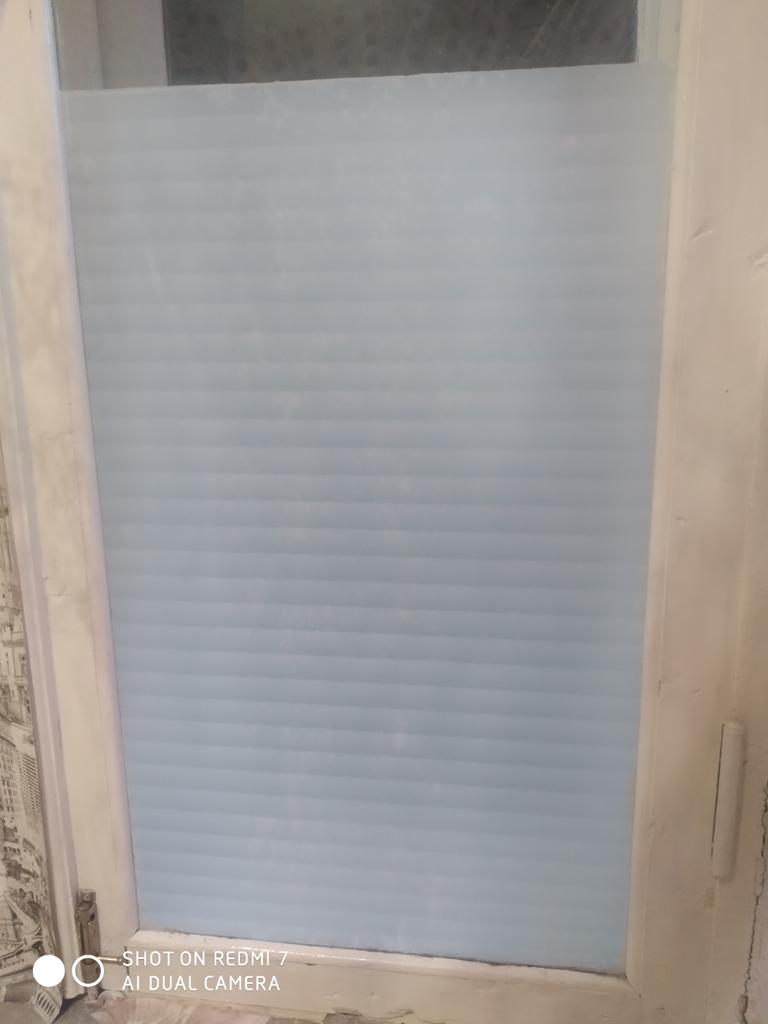 Клеится как обычная клейкая пленка, но результат отличный. Пропускает солнечный свет, но не позволяет зевакам заглядывать в окно.