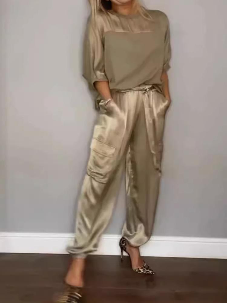 Женский комплект, однотонный комплект из гладкого атласа, топ с рукавами три четверти и брюки, комплект из двух предметов — купить товар онлайн с бесплатной доставкой по всему миру!
