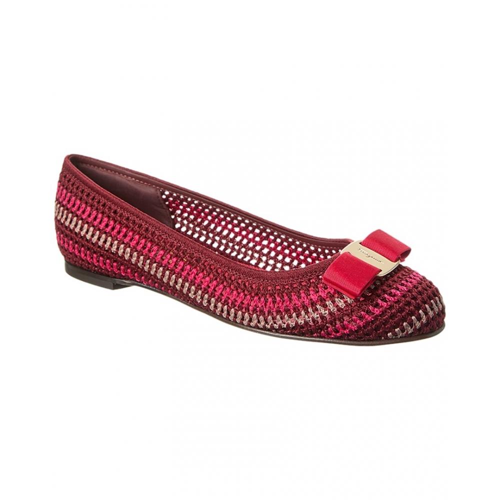 Introducing the Ferragamo Varina Flat - a stylishly elegant flat featuring stunning Nebbiolo and Strawberry fabric, complemented by gold-tone hardware and a grosgrain Vara bow accent.