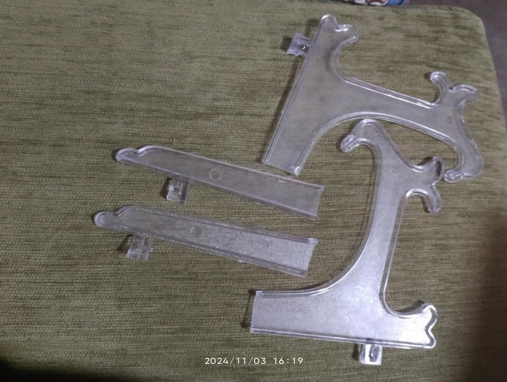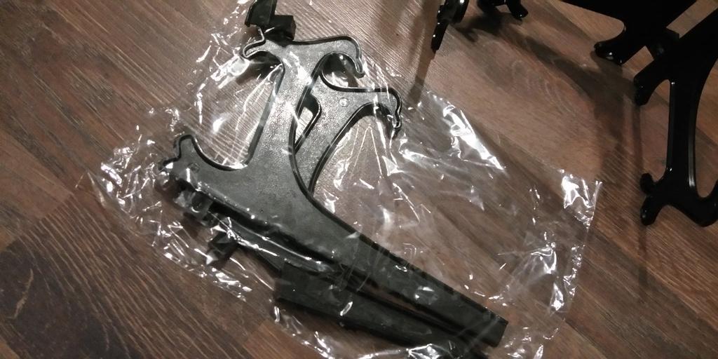 К сожалению, подставка для декоративной тарелки при перевозке сломалась. Похоже, по ней потоптались. На сломанных прозрачных элементах чёрная грязь. Очень жаль. Задумка хорошая.Две детали должны были соединяться штырьками.