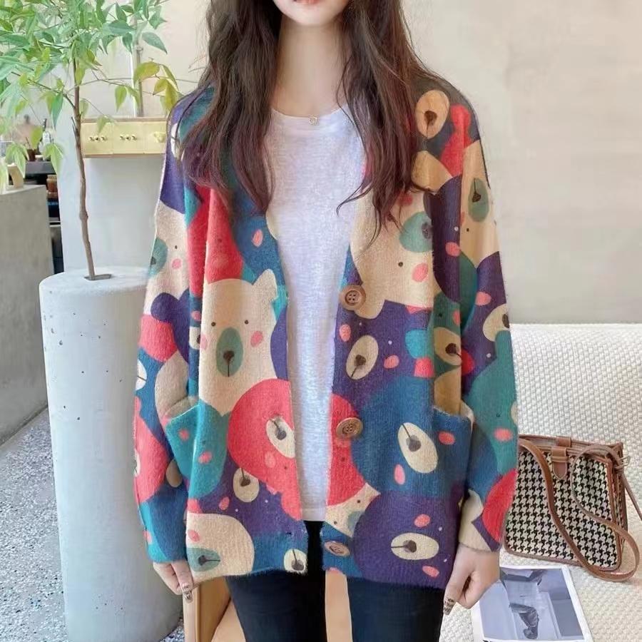 Dimanaf Новинка 2024 года, осенние свитера больших размеров, кардиган большого размера, женские свитера с цветочным принтом и мультяшным принтом, вязаный свитер