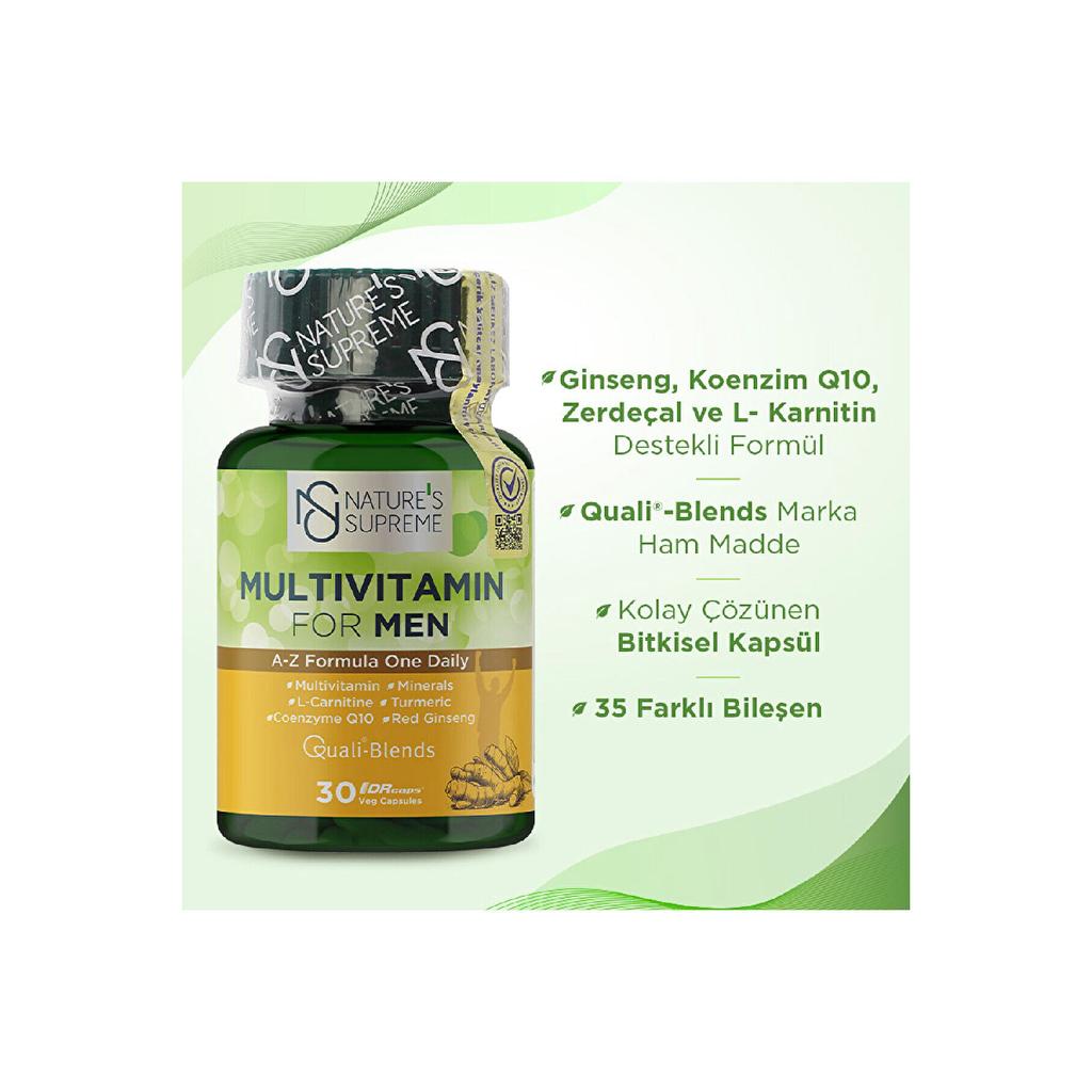 Описание мультивитаминов Nature's Supreme для мужчин, 30 шт. Что такое мультивитамины Nature's Supreme для мужчин? Nature's Supreme Multivitamin для мужчин — это поливитаминный препарат, содержащий куркуму.. Мультивитамин Nature's Supreme для мужчин, содержащий больше витаминов и минералов, необходимых мужчинам ежедневно, дополнен куркумой, коэнзимом Q10 и женьшенем.. Quali-Blends, сырье витаминных компонентов, является запатентованным брендом DSM, ведущей компании по производству и разработке витаминов в мире.. Функции основных витаминов и минералов, содержащихся в натуральных мультивитаминах для мужчин:* - Витамин С способствует нормальному энергетическому обмену.. - Витамин B6 способствует нормальному метаболизму белков и гликогена.. - Биотин способствует поддержанию нормальных волос.. - Витамин B12 способствует снижению утомляемости и усталости.. - Витамин D способствует поддержанию нормальных костей. Особенности мультивитаминов Nature's Supreme для мужчин: - Мультивитамин, подходящий для мужчин, состоящий из 35 ингредиентов. - Формула с добавлением куркумы, коэнзима Q10 и женьшеня. - Травяные капсулы, подходящие для вегетарианского использования. - Производство в соответствии со стандартами ISO 9001, 22000, GMP и на сертифицированных предприятиях халяль. - Происхождение основного ингредиента продукта.: Франция Что означает надпись Bandrol на продукте? Знак качества, который вы видите, указывает на то, что этот продукт прошел микробиологические тесты и анализы, а заявленное в нем содержание проверено.. Качество и точность заявленного контента Nature's Supreme проверены в независимых лабораториях с сертификатом аккредитации TRKAK.. Эти лаборатории входят в число ведущих центров микробиологического анализа в Европе.. Анализы проводятся в этих передовых лабораториях.. Бренд Nature's Supreme продолжает эту практику во всех вариантах своей продукции и проводит все необходимые анализы.. Идеальное предложение по хранению: Не удаляйте осушитель внутри изделия.. Держите его подальше от влажных помещений, таких как кухня, ванная комната, холодильник, и плотно закройте крышку.. Хранить в прохладном сухом месте. Из-за повышенной влажности на водорастворимых витаминах могут появиться небольшие коричневые или красные пятна. (витамины В и С). Это нормально. Это изменение не препятствует использованию витамина.. По мере увеличения количества пятен эффективность продукта может со временем снизиться.. Убедительно просим вас обратить внимание на рекомендации по идеальному хранению для максимально полезного использования.. Отчет об утверждении качества: Уровень для начинающих. Взрослым рекомендуется принимать по 1 капсуле в день.. Средний уровень. Взрослым рекомендуется принимать по 1 капсуле в день.. Продвинутый уровень. Взрослым рекомендуется принимать по 1 капсуле в день.. Мультивитамины Nature's Supreme для мужчин, 30 капсул. Положительные отзывы. Добавление куркумы, запатентованное сырье, проверенное качество ингредиентов. Мультивитамины Nature's Supreme для мужчин, 30 капсул, не содержат аспартам, свиные добавки, мясные продукты, глютен, консерванты, красители, возрастной диапазон ГМО.: От 21 до 39 лет, более 40 целей: Энергия, здоровье суставов, мышечная масса, здоровый образ жизни, физическая форма — пол диеты: Тип мужского ингредиента: Активные ингредиенты в капсулах: Мультивитамины, витамин А, витамин В1, витамин В12, витамин В2, в