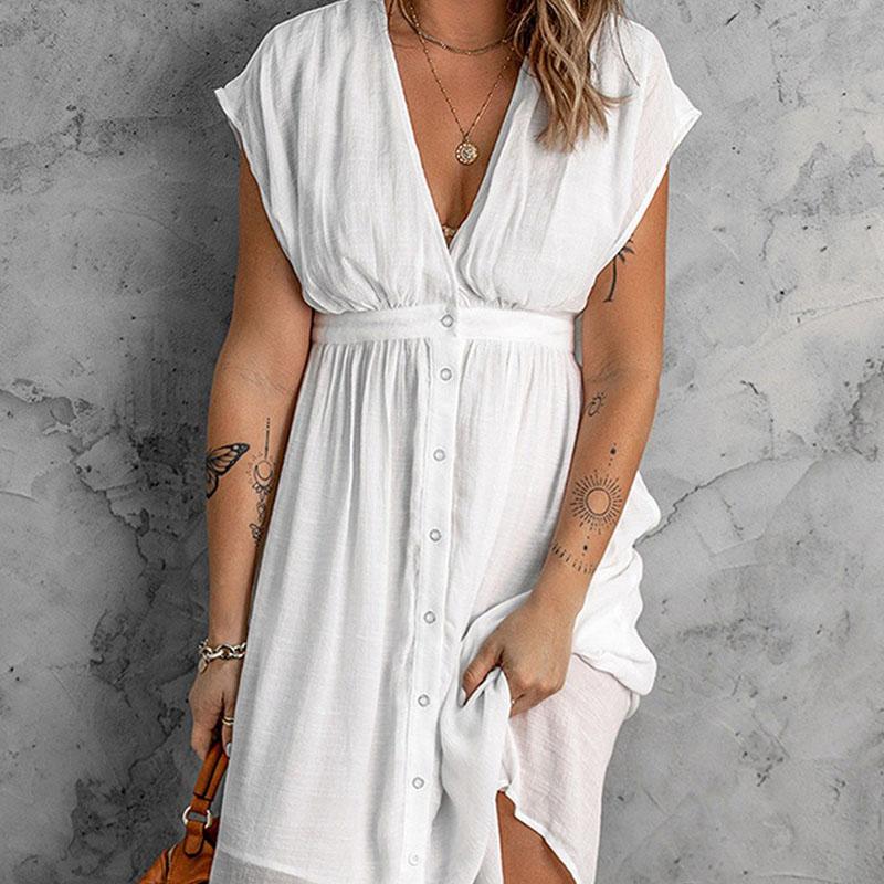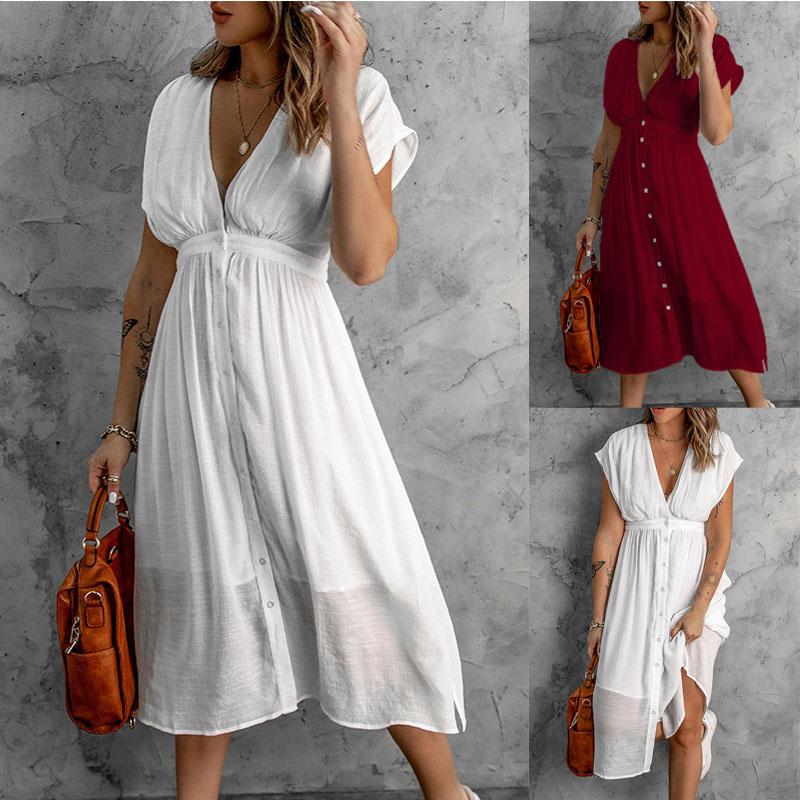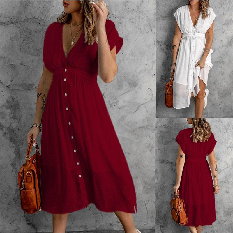 Женское платье макси, длинное праздничное платье с V-образным вырезом и пляжными пуговицами, женский летний сарафан