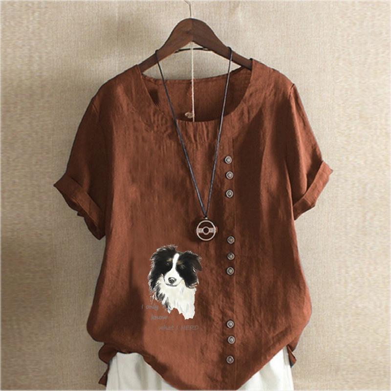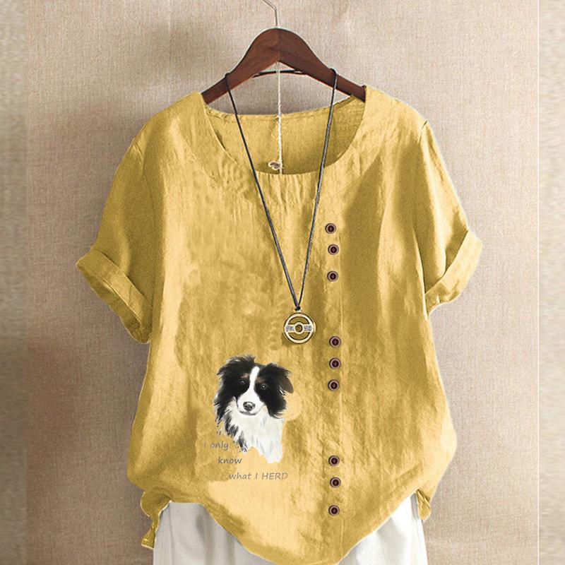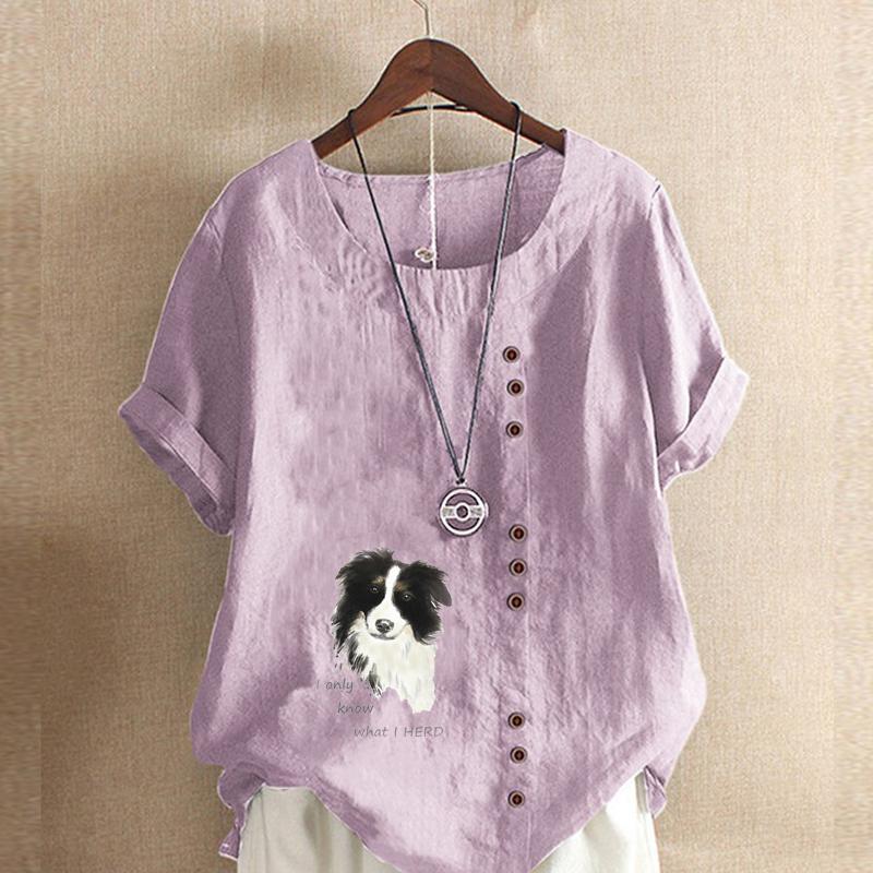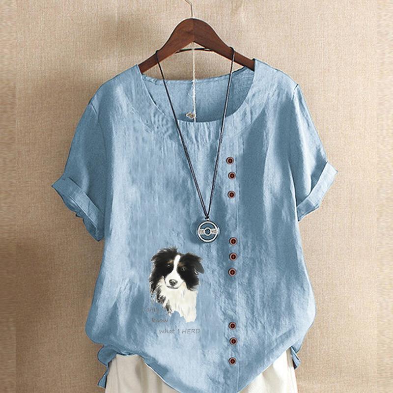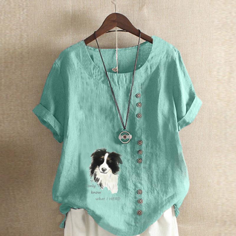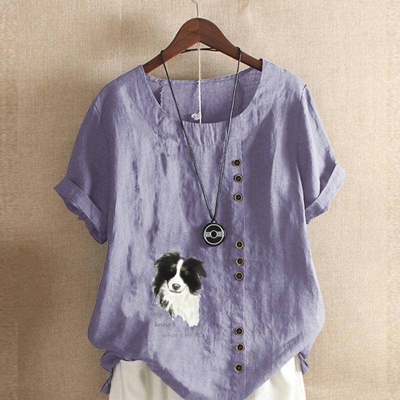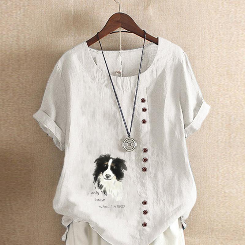 Женская модная футболка с круглым вырезом и коротким рукавом, повседневная хлопковая льняная рубашка с рисунком, свободная летняя блузка с принтом для отдыха с милой собакой, топы