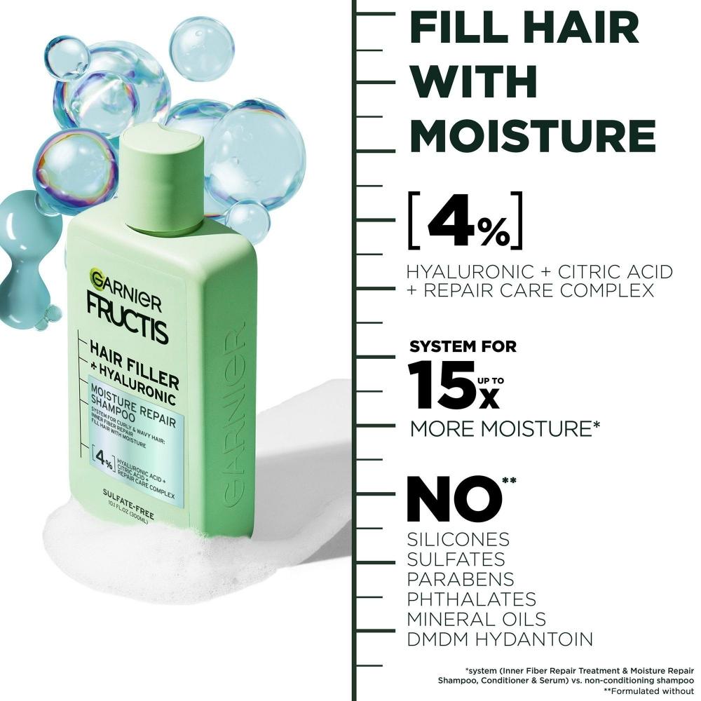 В шампуне Garnier Fructis Hair Filler Moisture Repair теперь представлена безсульфатная система Hair Filler + Hyaluronic, в состав которой входят гиалуроновая кислота + лимонная кислота + комплекс Repair Care, наполняющий волосы влагой.